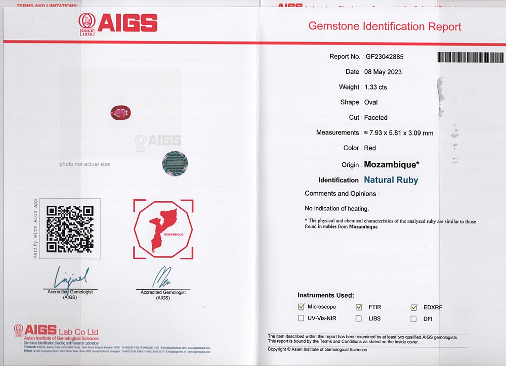 AIGS certified No Heat - view slideshow for a scan of the certificate. This is a beautiful and rare Mozambique Ruby. A fine crystal with high transparency and a stunning intense vivid Red hue.