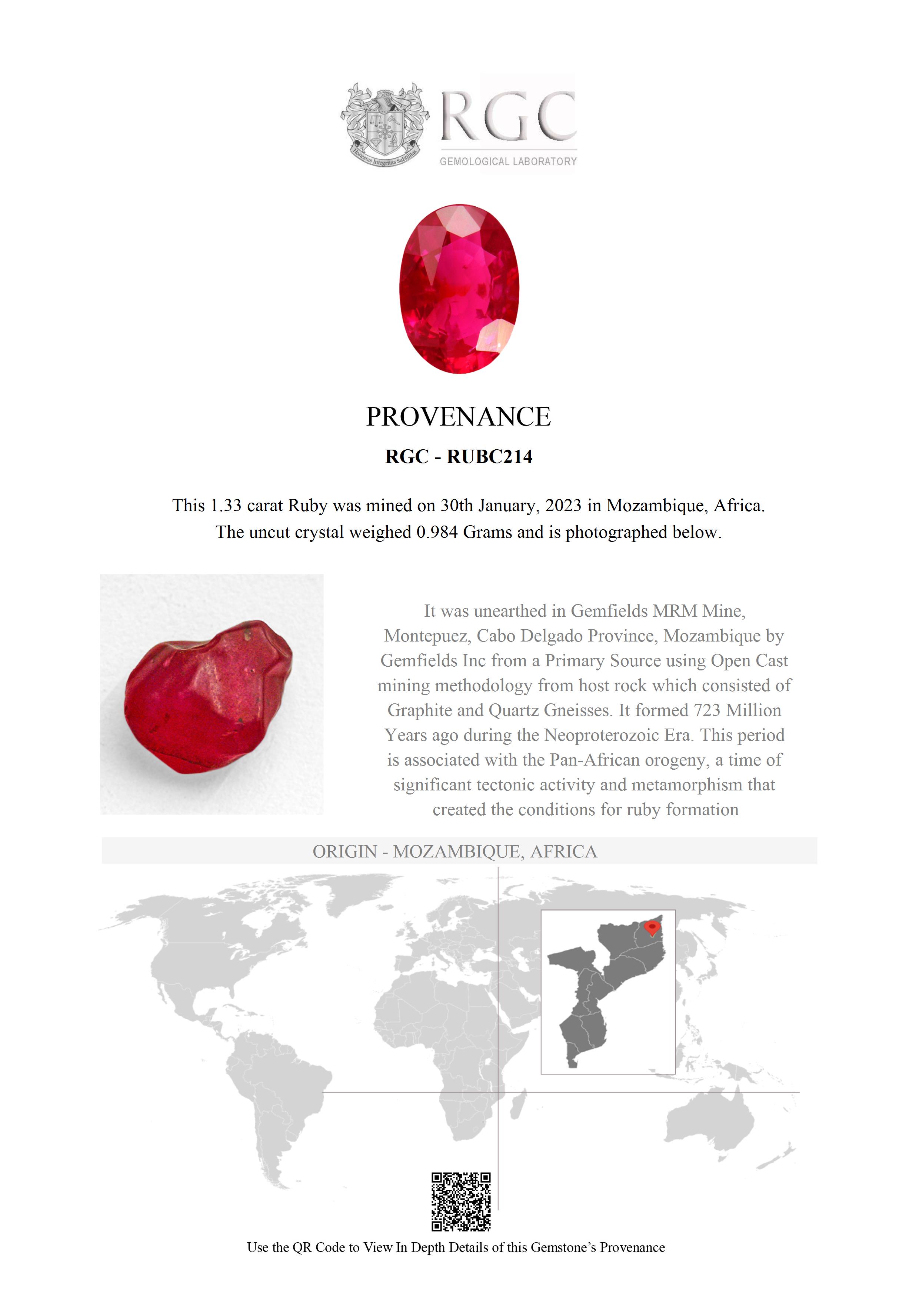 800 million years ago, a momentous geological event occurred called the Pan-African tectonic event. The change in the geology as a result of this event, created suitable conditions for the formation of gemstones. These gemstones are much older than the Himalayan range gem deposits such as Burmese rubies, that are only 40 million years old. This gorgeous Ruby hails from these auspicious origins. As an official sightholder of Gemfields, The Rare Gemstone Company is proud to be able to offer it here