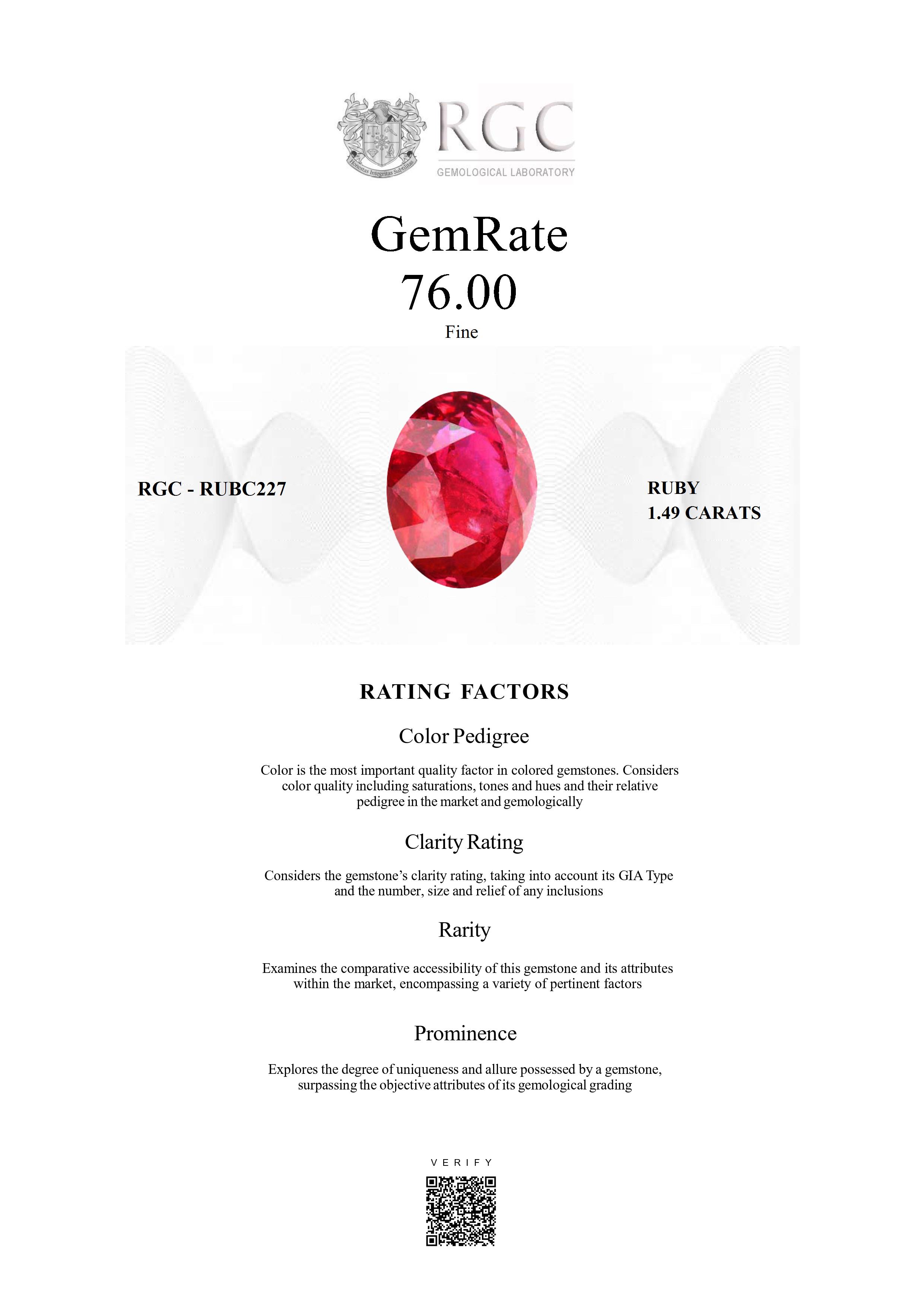 The RGC GemRate is a revolutionary system that addresses the importance and difficulty of comparing different colored gemstones with their peers in the marketplace. It assesses a wide variety of factors that exist in the marketplace and gemologically to classify gems in their genre using a standardized rating system. These factors are myriad but include quantifiable factors like color grade, clarity and cut, rarity factors examining relative rarity and also qualitative factors such as prominence, which examines the degree to which a gemstone stands out and captivates beyond just its measurable quality traits. It's essentially the stone's ability to catch attention and distinguish itself from others.