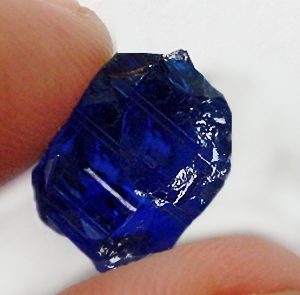 This Tanzanite is over 510 Million Years old. After being removed from the vein and "knocked" to remove the host rock, this Tanzanite weighed 8.050 Grams. The photograph on the left, shows it as it looked at this stage in its journey. Tests showed it has a Specific Gravity of 3.35, an optic character of DR Biaxial and it formed in the Othorhombic crystal system. Its Chemical Composition is Calcium Alluminium Silicate and its Cause of Color is Vanadium