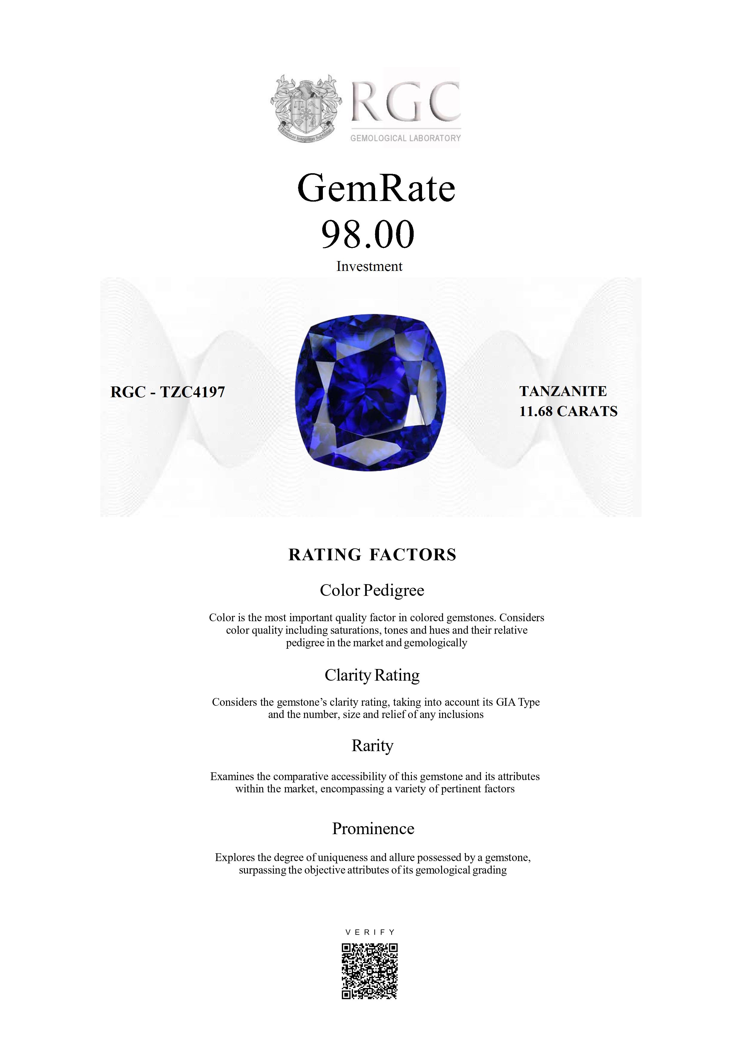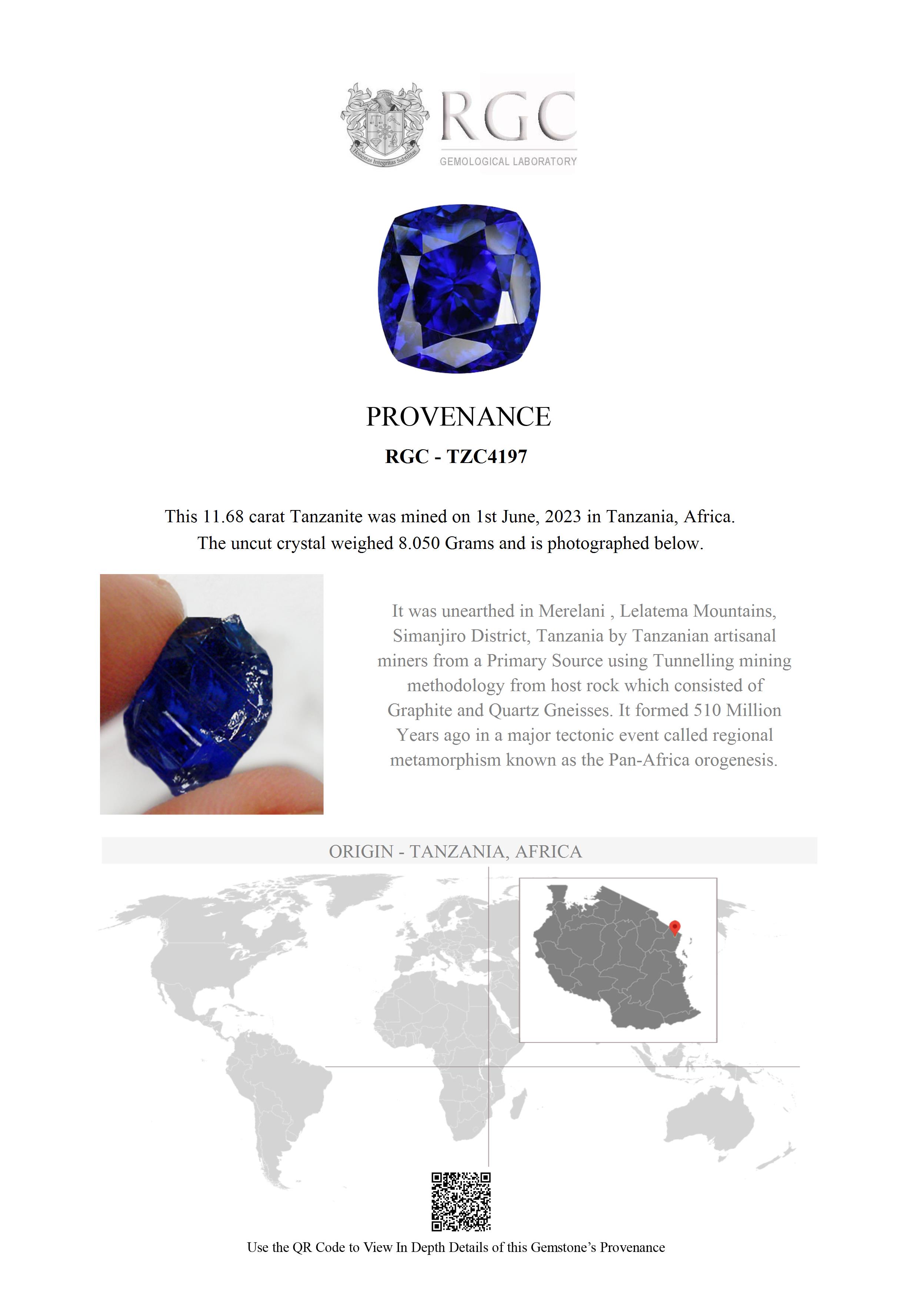 Utterly outstanding and a true investment grade Tanzanite. Surpassing even the very finest Kashmir cornflower blue Sapphire, this ethereal 11.68 carat cushion cut piece is a joy to behold. Glittering with life, the deepest most explosive color saturation possible. Flawless and professionally cut. As intense as its blue color is in daylight, it is more than evenly matched by the intensity of the red flash in incandescent light - a kaleidoscope of reds and violets emanating from deep within the stone. An extremely rare and extremely beautiful Tanzanite of the very finest pedigree.