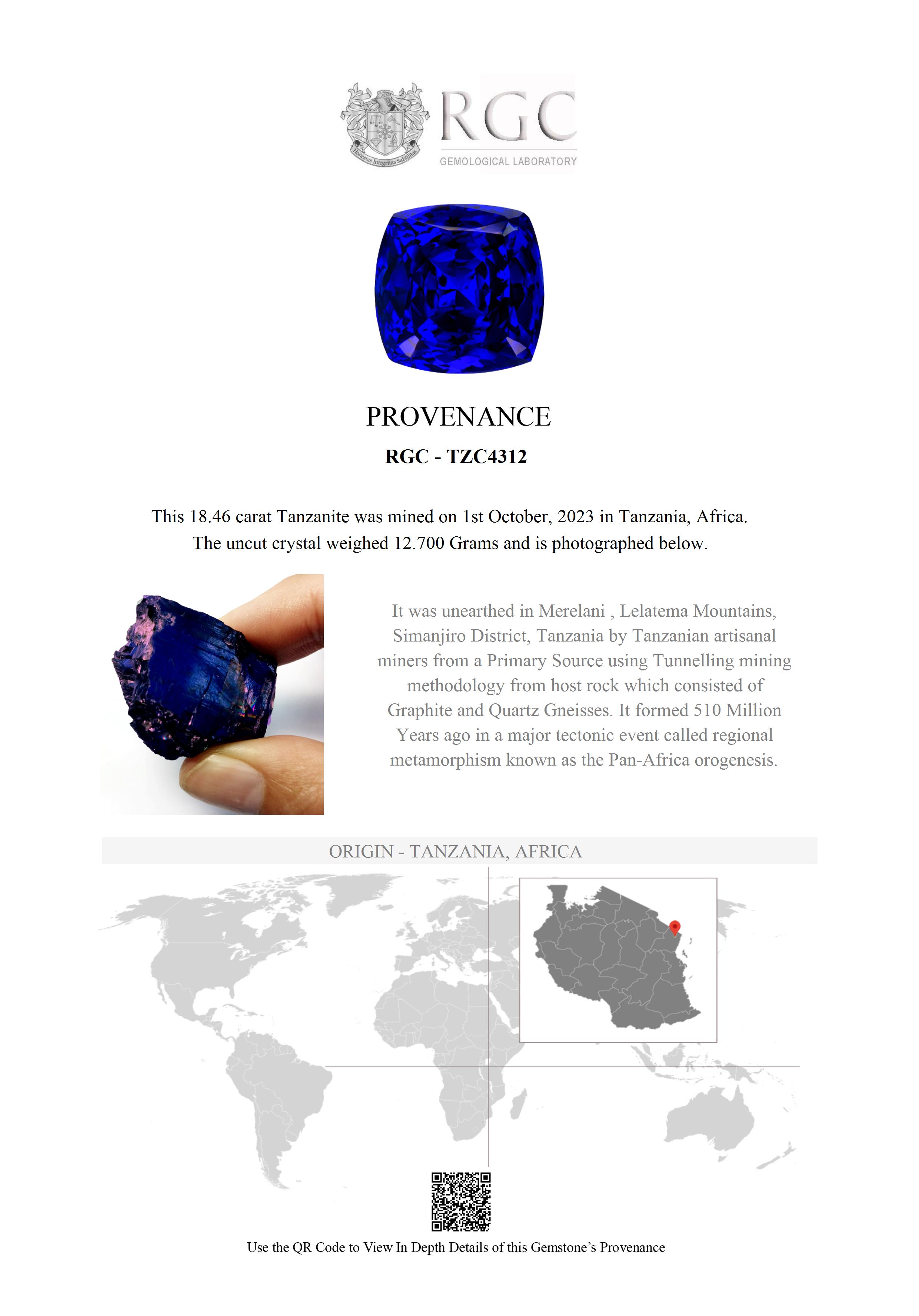 Utterly outstanding and a true investment grade Tanzanite. Surpassing even the very finest Kashmir cornflower blue Sapphire, this ethereal 18.46 carat cushion cut piece is a joy to behold. Glittering with life, the deepest most explosive color saturation possible. Flawless and professionally cut. An extremely rare and extremely beautiful Tanzanite of the very finest pedigree.
