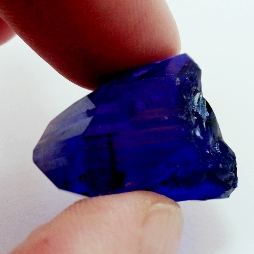 This Tanzanite is over 510 Million Years old. After being removed from the vein and "knocked" to remove the host rock, this Tanzanite weighed 19.618 Grams. The photograph on the left, shows it as it looked at this stage in its journey. Tests showed it has a Specific Gravity of 3.35, an optic character of DR Biaxial and it formed in the Othorhombic crystal system. Its Chemical Composition is Calcium Alluminium Silicate and its Cause of Color is Vanadium