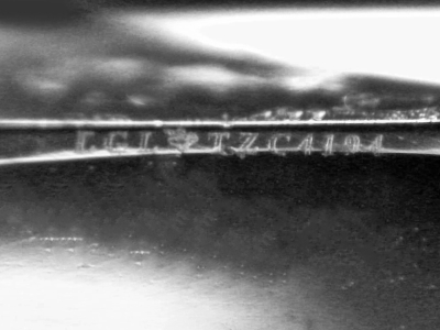 This image is an actual photograph of the laser inscription on this particular gemstone. Photography is done using a microscope camera at 45 x magnification to render the image.