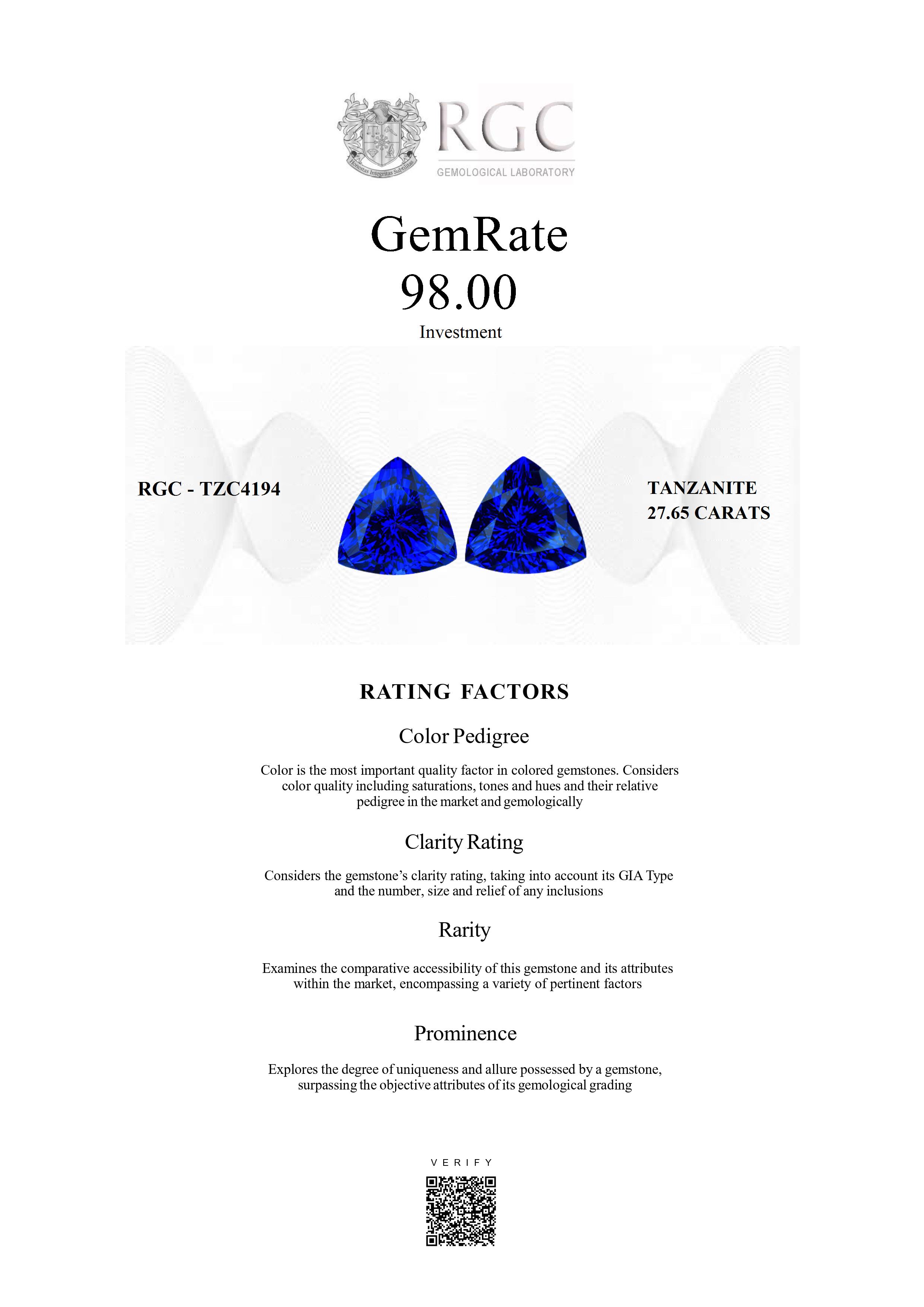 Experienced gemologists forensically examine each gemstone and apply ratings across all factors with different weightings to come up with a single number and classification thereby providing comparability by reducing the complexity inherent to colored gemstones.