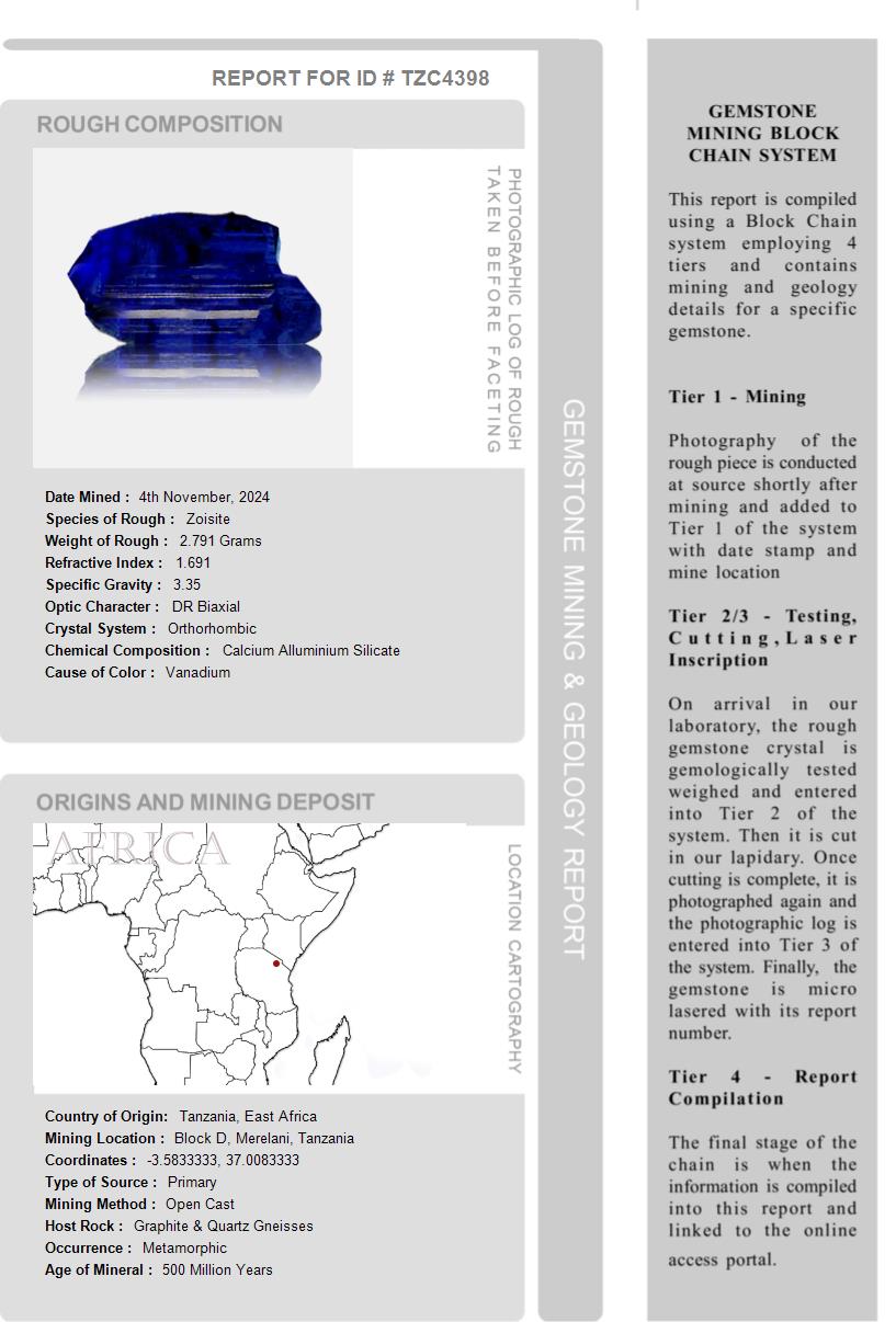 This Tanzanite is over 510 Million Years old. After being removed from the vein and "knocked" to remove the host rock, this Tanzanite weighed 2.791 Grams. The photograph on the left, shows it as it looked at this stage in its journey. Tests showed it has a Specific Gravity of 3.35, an optic character of DR Biaxial and it formed in the Othorhombic crystal system. Its Chemical Composition is Calcium Alluminium Silicate and its Cause of Color is Vanadium