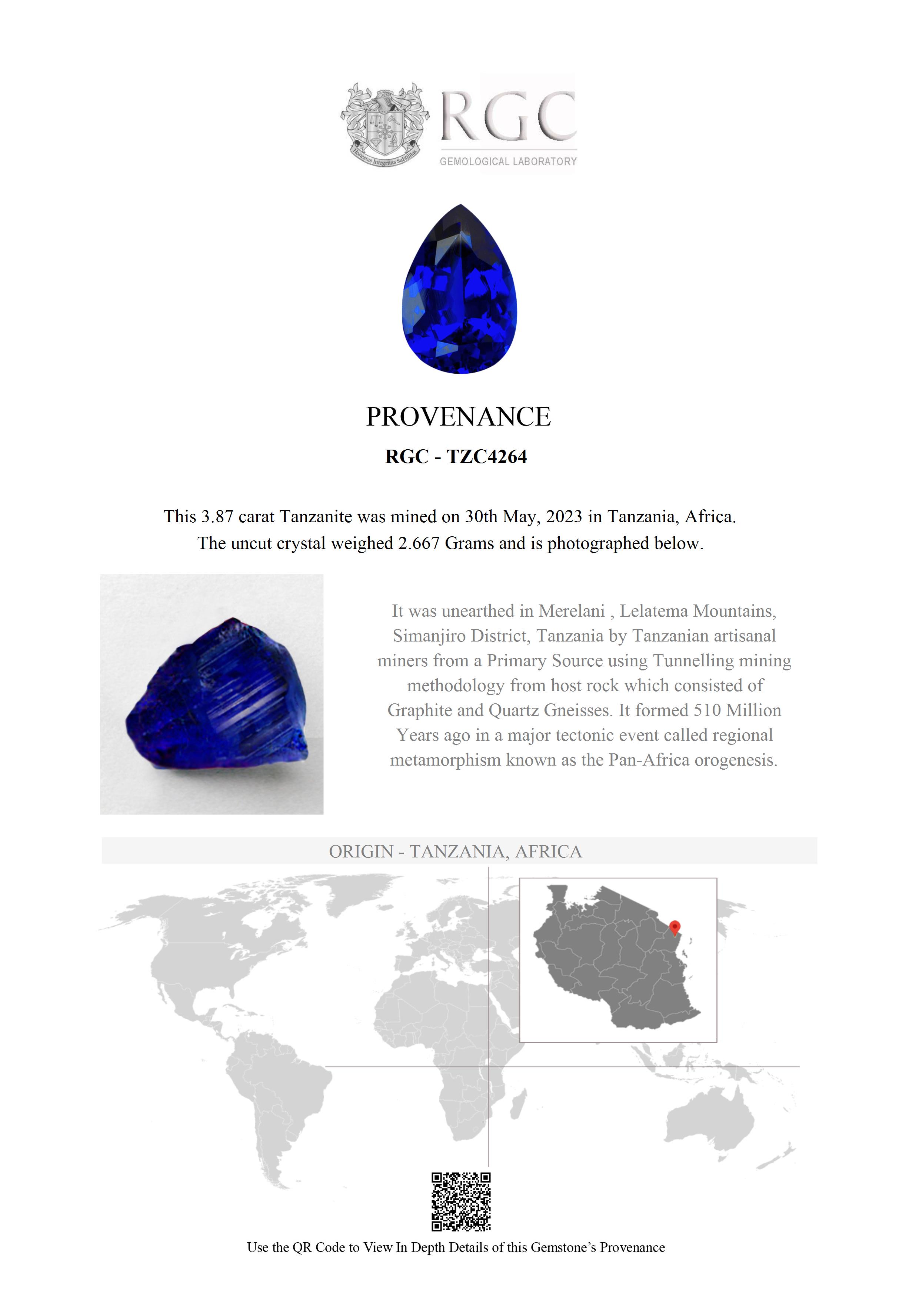 They don't come better. If you are looking for an extremely fine Tanzanite in the 3 carat range and all you have seen are violet, pale stones, you are not alone. Tanzanites in smaller sizes with true vB 6/6 intense colors are very rare and difficult to find. Look no further. This wonderful 3.87 carat pear breaks all the rules. Cut on the blue axis, boasting an incredible intense vivid saturation that has to be seen to be believed. Flawless. Rare and superb.