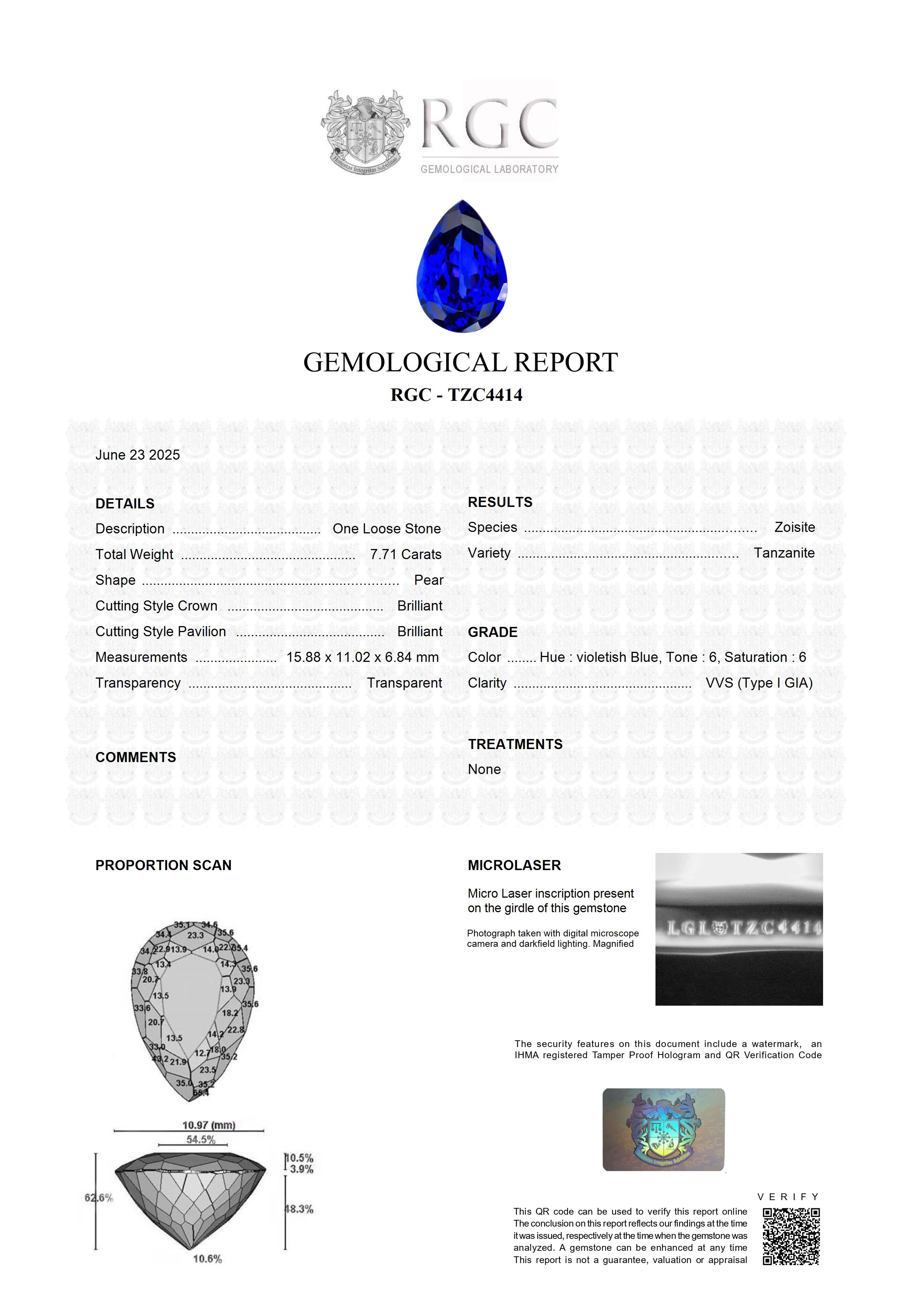 Simply as good as it gets. Cut directly on the blue axis, so if you like your Tanzanite looking like top grade blue Sapphire, this is the stone for you. However, the similarity to Sapphire ends when seen under incandescent light as a riot of red flashes engulf the stone. It displays a robust and highly coveted intense red flash effect. Classic, Investment grade Block D material- a very deep, intense color saturation that is only seen in the very finest 1% of Tanzanites. Flawless clarity. Well cut with plenty of brilliance due to the preponderance of facets on the pavilion. A very fine piece.