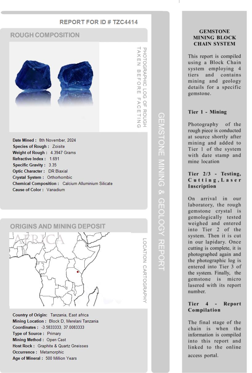 This Tanzanite is over 510 Million Years old. After being removed from the vein and "knocked" to remove the host rock, this Tanzanite weighed 4.3947 Grams. The photograph on the left, shows it as it looked at this stage in its journey. Tests showed it has a Specific Gravity of 3.35, an optic character of DR Biaxial and it formed in the Othorhombic crystal system. Its Chemical Composition is Calcium Alluminium Silicate and its Cause of Color is Vanadium