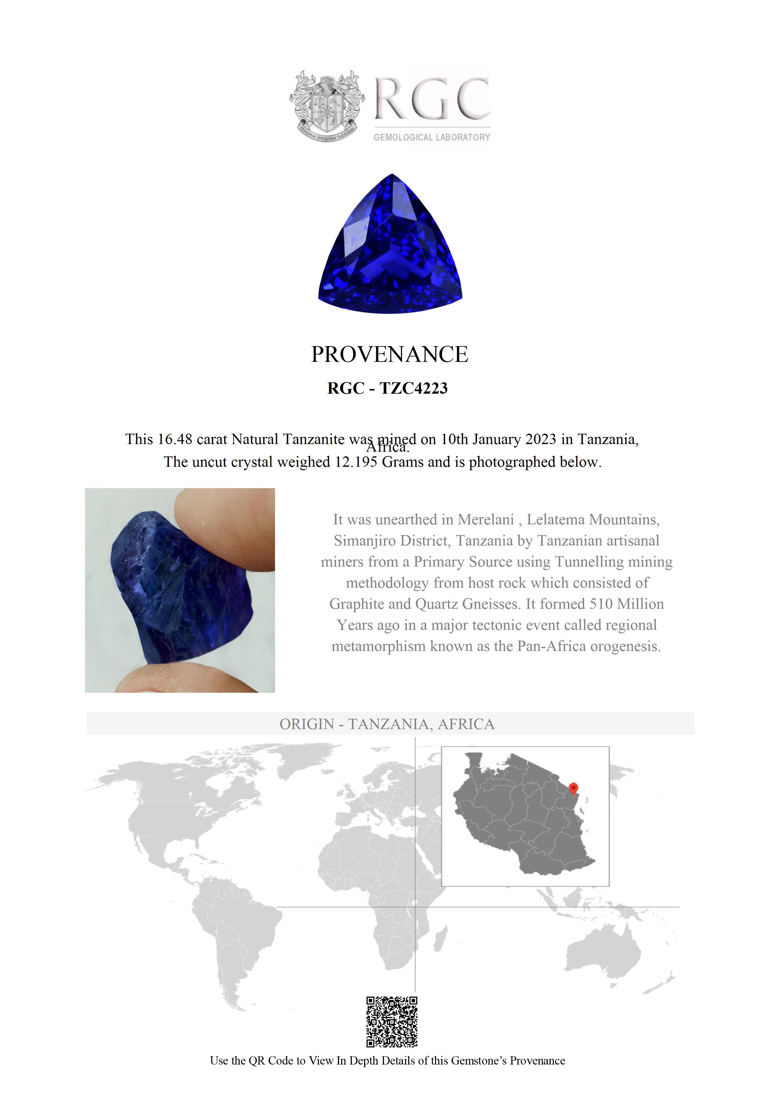 A quintessential investment Tanzanite. If you are looking for a very deep blue Tanzanite in the 15+ carat range, look no further. This absolutely amazing 16.48 carat sparkling Trillion is truly exceptional. Like gazing into a bottomless pool, the color is unfathomable - an ethereal, almost velvety blue. These colors are extremely rarely mined and we spend a great deal of time working with the miners to secure them. The stone glitters with life and vitality. Under incandescent light it explodes with red flash - crimsons and reds dance throughout. Flawless and beautifully cut. A truly rare and beautiful piece.