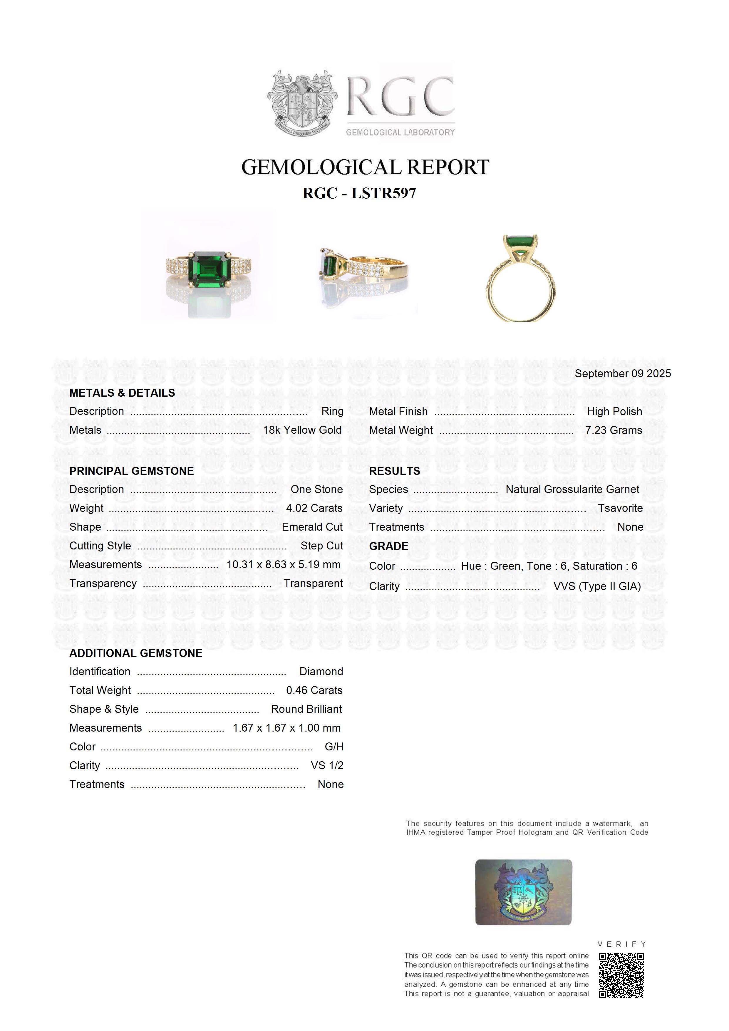 Center Stone: This is an extremely fine Tsavorite. At 4.02 carats it is a very rare piece as Tsavorite crystals large enough to cut such a large stone are found only a few times a year and of these only a few are fine qualities. This beautiful piece is virtually flawless which is unusual in Tsavorites of this size. It has top color - a very clean, sharp green hue only found in the Kenyan original Tsavo deposits. The stone is very well cut. An exceptional and truly rare and very fine Tsavorite.