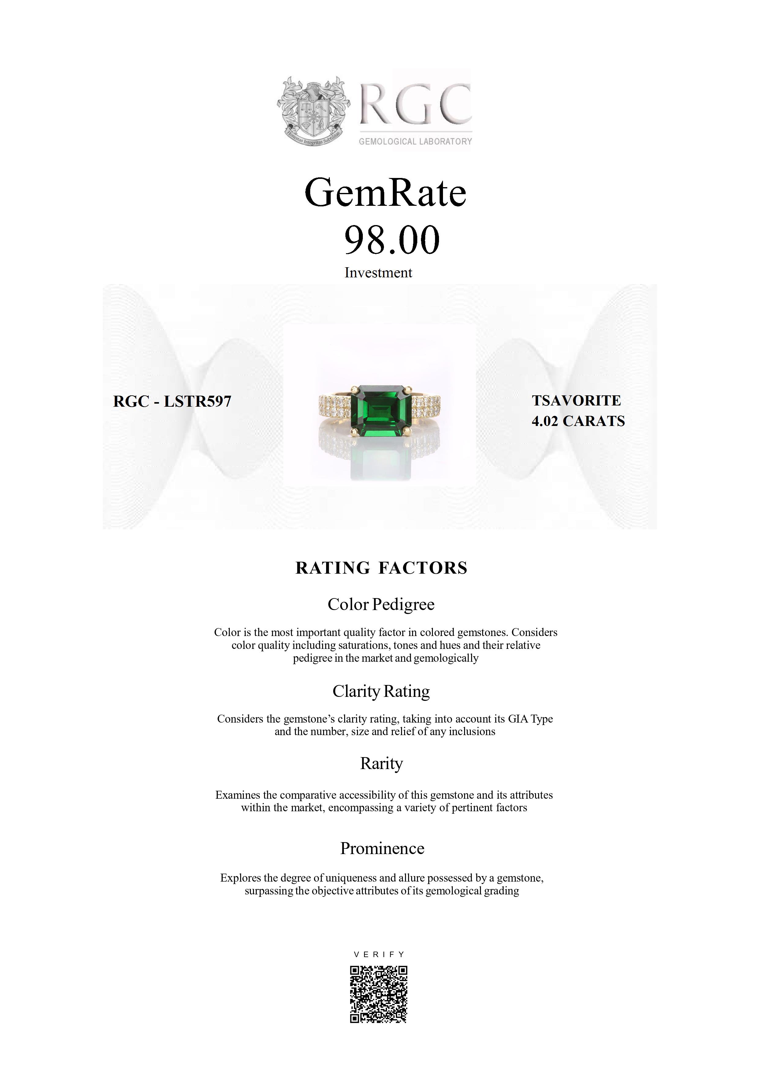 The RGC GemRate is a revolutionary system that addresses the importance and difficulty of comparing different colored gemstones with their peers in the marketplace. It assesses a wide variety of factors that exist in the marketplace and gemologically to classify gems in their genre using a standardized rating system. These factors are myriad but include quantifiable factors like color grade, clarity and cut, rarity factors examining relative rarity and also qualitative factors such as prominence, which examines the degree to which a gemstone stands out and captivates beyond just its measurable quality traits. It's essentially the stone's ability to catch attention and distinguish itself from others.