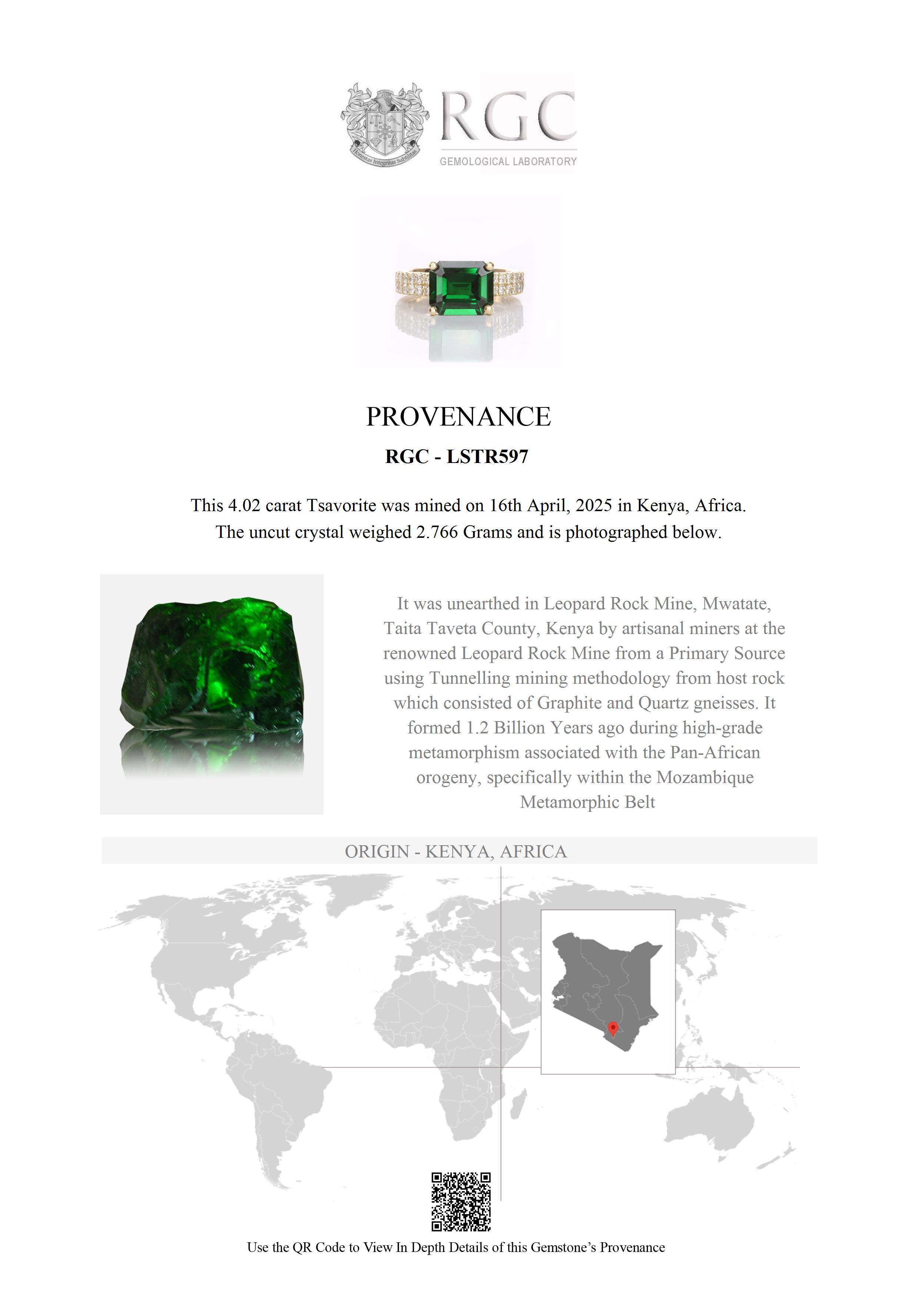 The center stone in this beautiful piece is a 4.02 Carats Tsavorite but it weighed 2.766 Grams in its rough state. The photograph here is the photographic log of it before we cut it. We include a full Mining and Geology Report with the piece when it ships so that you have a full genealogy for your unique Ring.