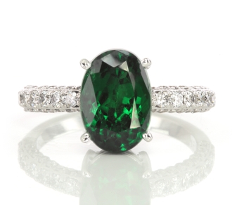 Center Stone: This is truly rare piece. Tsavorites in the 2+ carat range in top grades are rare; in 4 carats they are exponentially rarer. This stone has the added advantage of hailing from the renowned Kuranze mines in the original Tsavo deposit in Kenya. This mine is the only one that produces a bluish-green hue in Tsavorite, due to the high presence of Chromium as well as Vanadium. This mine's drawback is that most of the production is very included; so a 4 carat, virtually flawless intense bluish green st