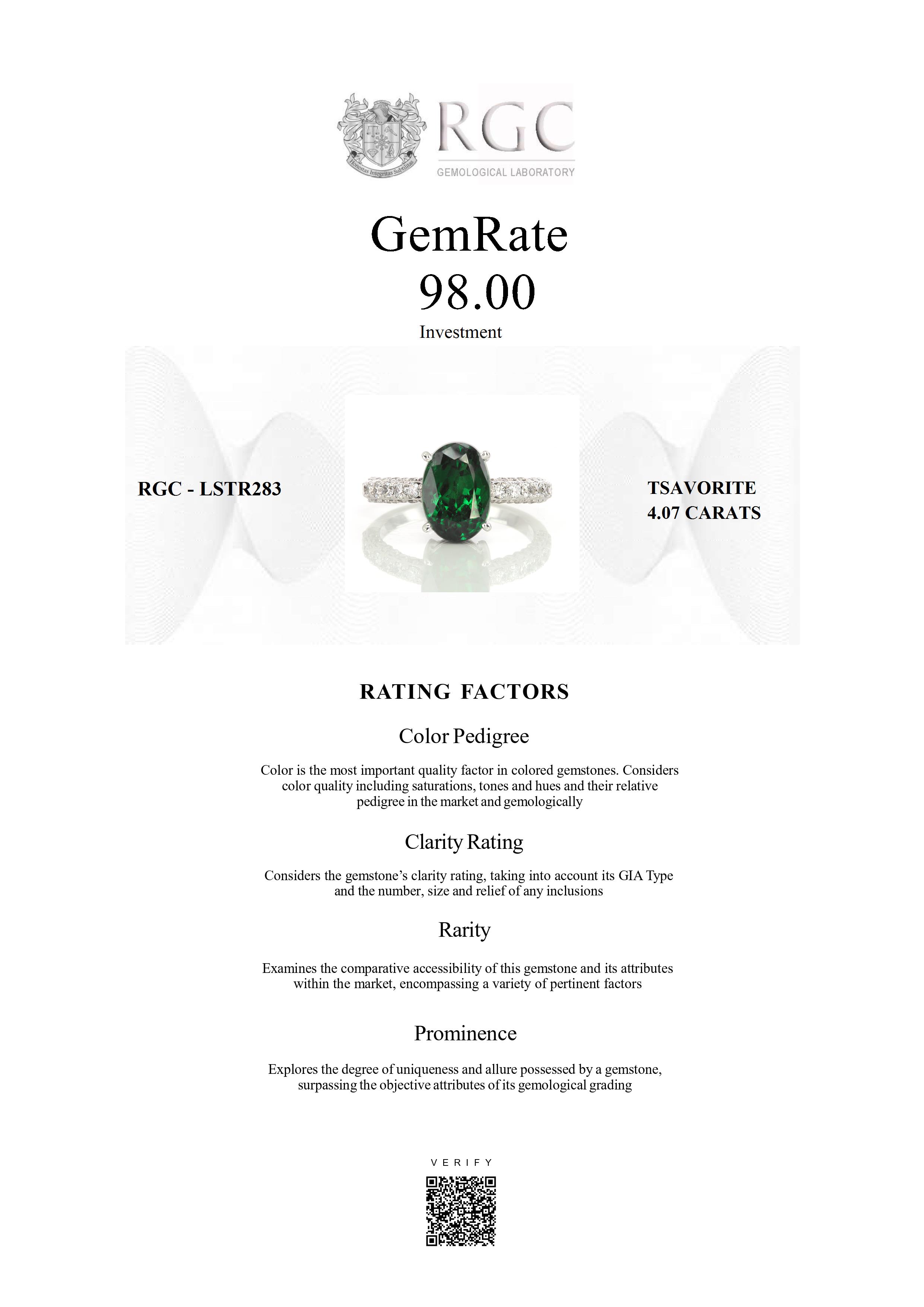 The RGC GemRate is a revolutionary system that addresses the importance and difficulty of comparing different colored gemstones with their peers in the marketplace. It assesses a wide variety of factors that exist in the marketplace and gemologically to classify gems in their genre using a standardized rating system. These factors are myriad but include quantifiable factors like color grade, clarity and cut, rarity factors examining relative rarity and also qualitative factors such as prominence, which examines the degree to which a gemstone stands out and captivates beyond just its measurable quality traits. It's essentially the stone's ability to catch attention and distinguish itself from others.