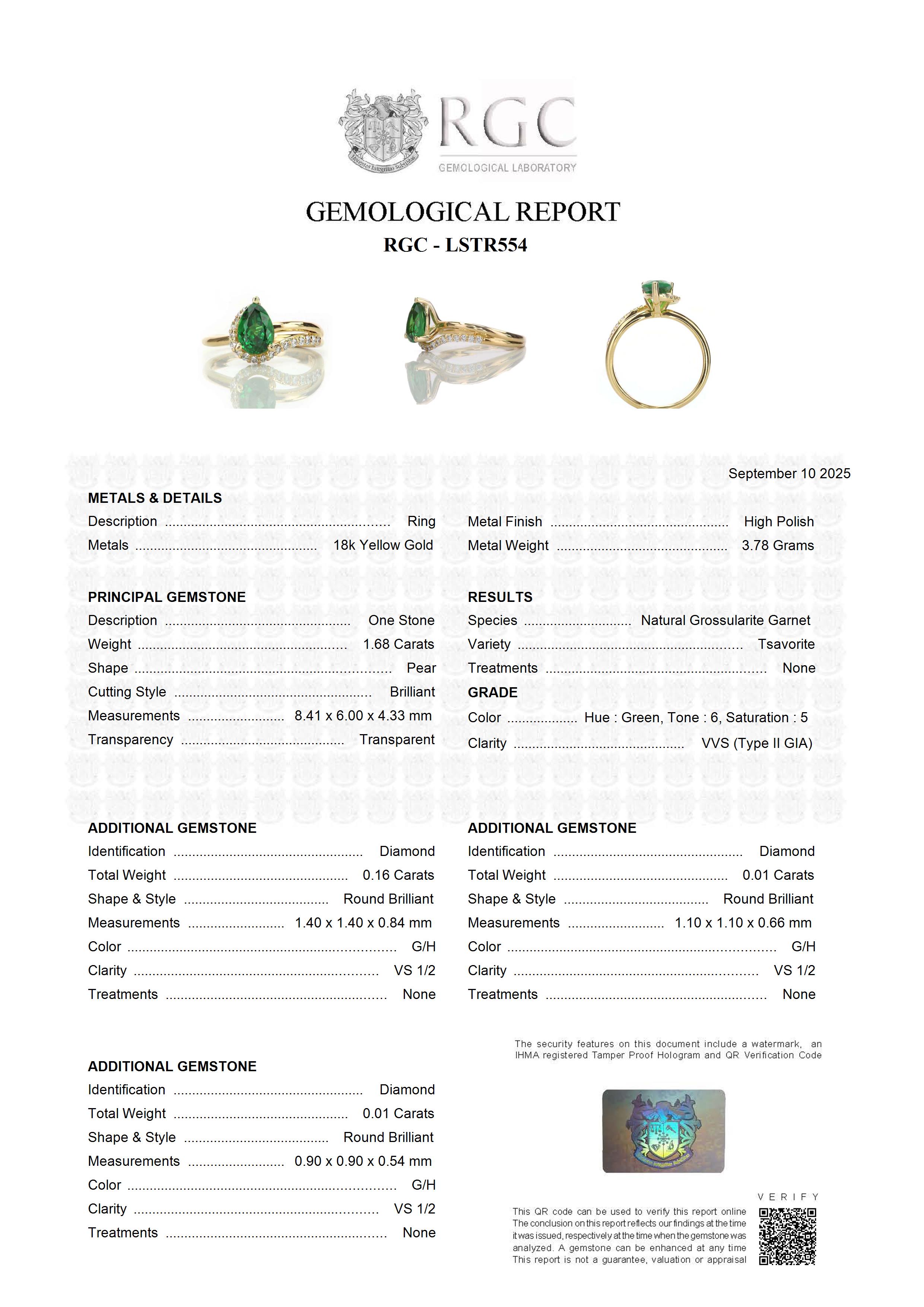 Center Stone: This is a superb Tsavorite, a scintillating example of gemstone perfection. Radiating a sparkling brilliance that gives it plenty of life. It embodies an exquisite shade of green that is gorgeously pure and breathtakingly vibrant. High clarity providing a vivid display of its lush green color.