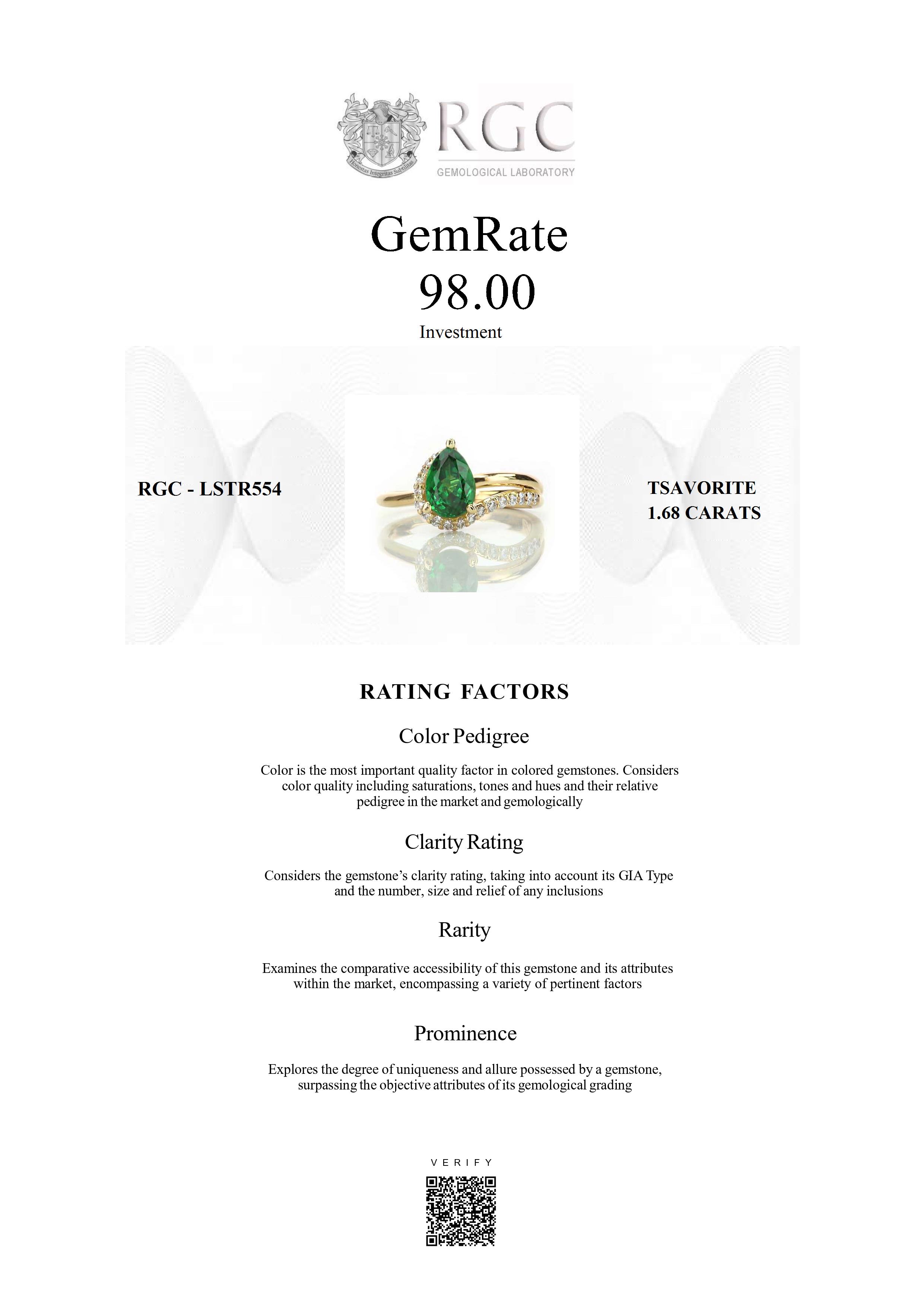 The RGC GemRate is a revolutionary system that addresses the importance and difficulty of comparing different colored gemstones with their peers in the marketplace. It assesses a wide variety of factors that exist in the marketplace and gemologically to classify gems in their genre using a standardized rating system. These factors are myriad but include quantifiable factors like color grade, clarity and cut, rarity factors examining relative rarity and also qualitative factors such as prominence, which examines the degree to which a gemstone stands out and captivates beyond just its measurable quality traits. It's essentially the stone's ability to catch attention and distinguish itself from others.