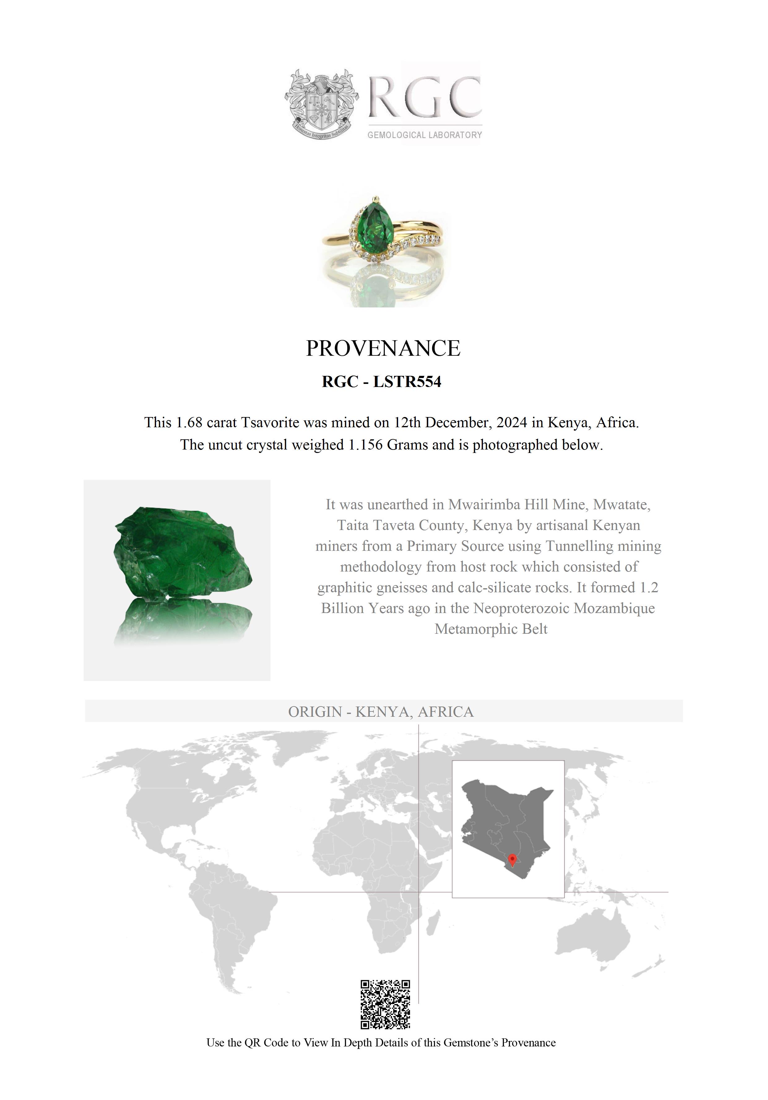 The center stone in this beautiful piece is a 1.68 Carats Tsavorite but it weighed 1.156 Grams in its rough state. The photograph here is the photographic log of it before we cut it. We include a full Mining and Geology Report with the piece when it ships so that you have a full genealogy for your unique Ring.