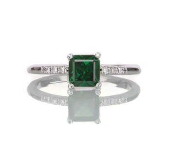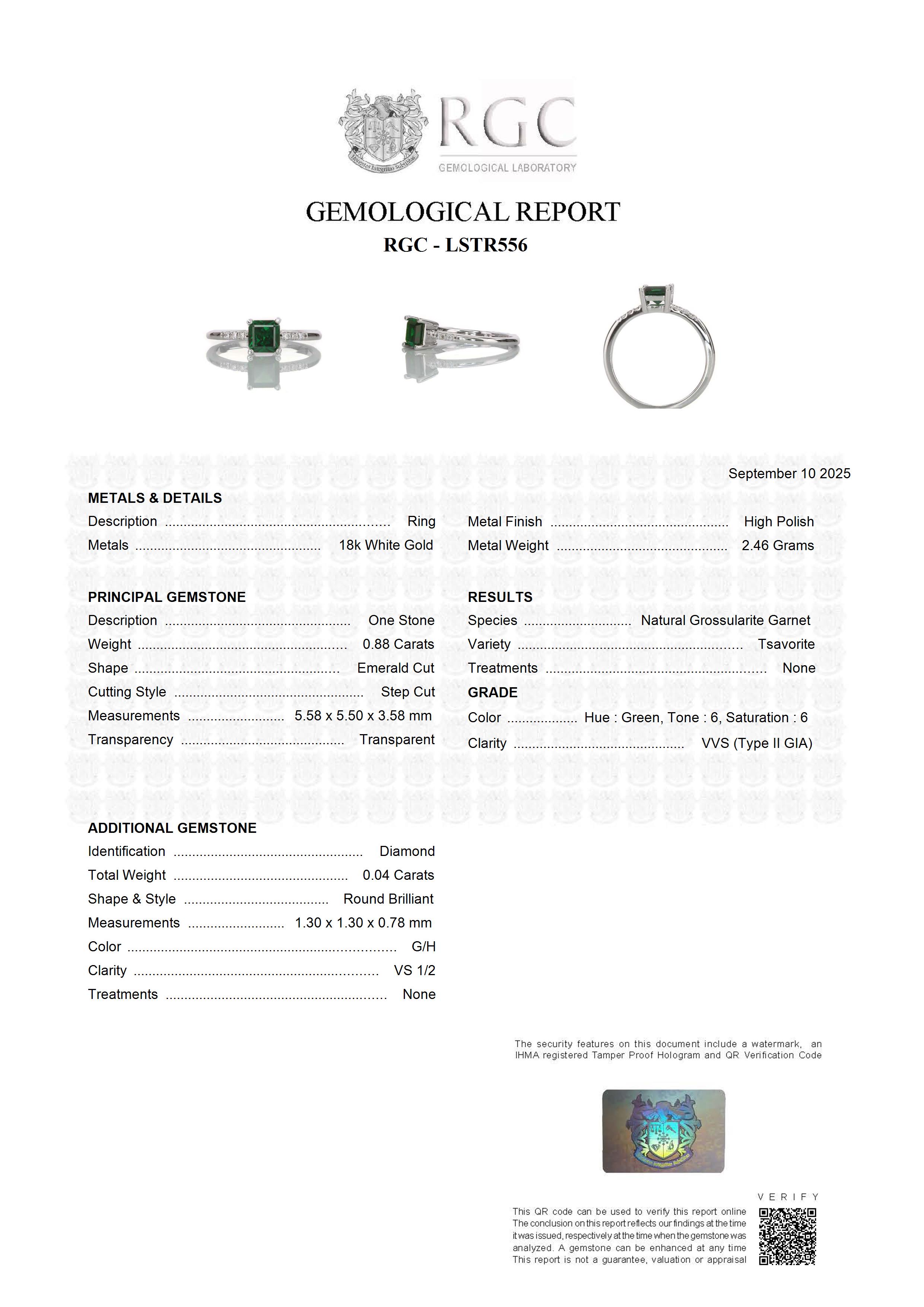 Center Stone: Stunning. This 0.88 carat, intensely saturated Tsavorite emerald cut is entirely flawless. They don't come better. The color is an intense, pure green of the finest grade and is conveyed to the eye on a wave of brilliance from deep within the stone.
