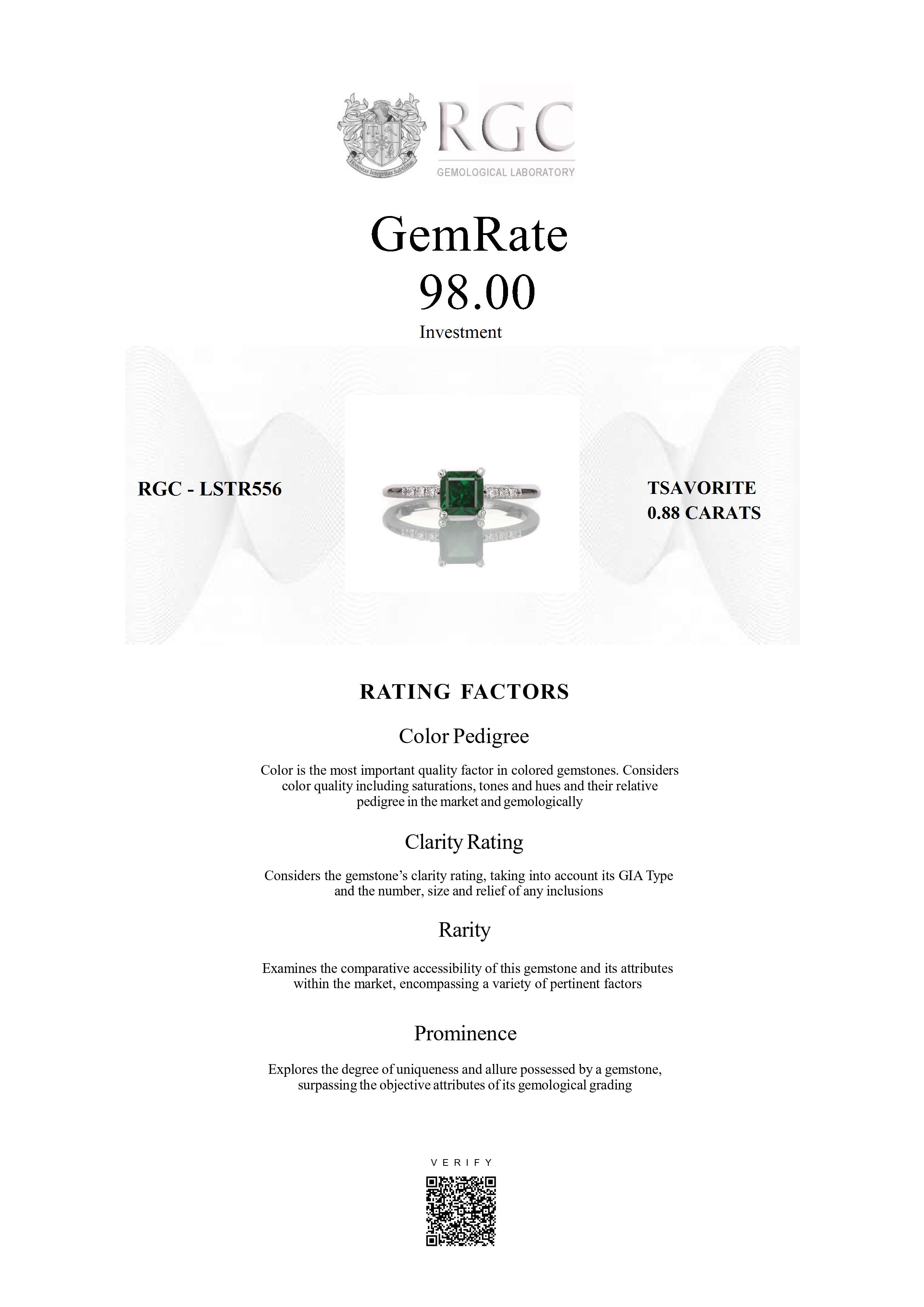 The RGC GemRate is a revolutionary system that addresses the importance and difficulty of comparing different colored gemstones with their peers in the marketplace. It assesses a wide variety of factors that exist in the marketplace and gemologically to classify gems in their genre using a standardized rating system. These factors are myriad but include quantifiable factors like color grade, clarity and cut, rarity factors examining relative rarity and also qualitative factors such as prominence, which examines the degree to which a gemstone stands out and captivates beyond just its measurable quality traits. It's essentially the stone's ability to catch attention and distinguish itself from others.