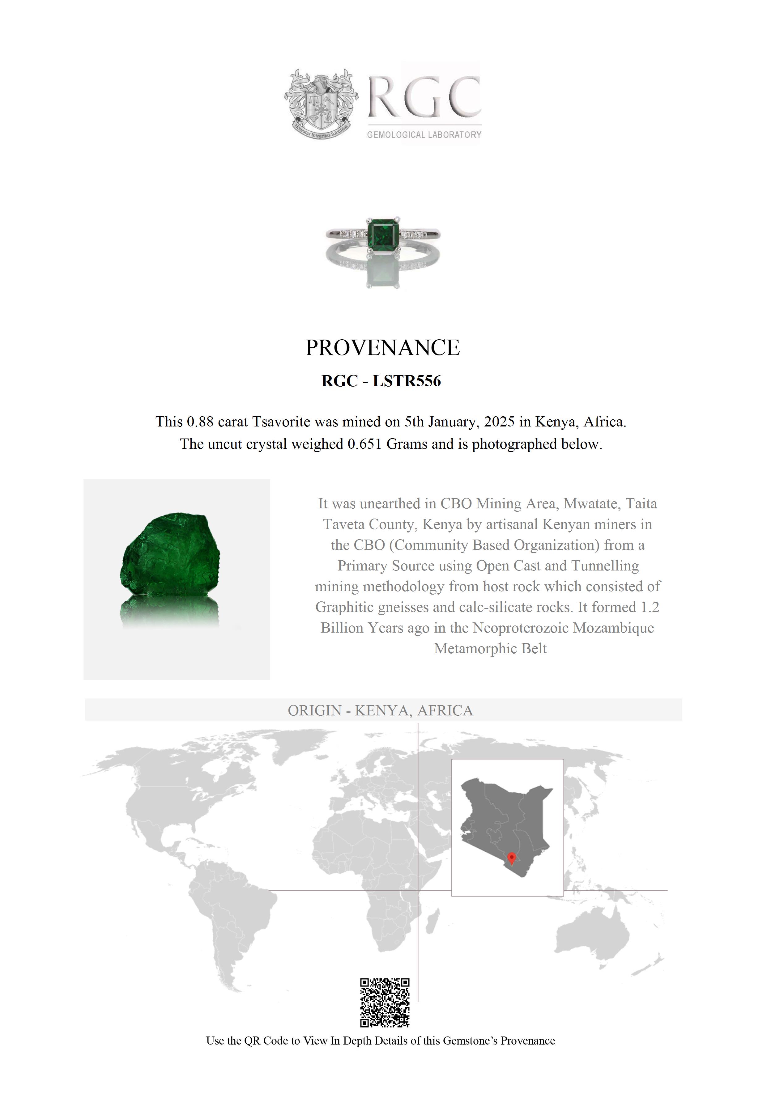 The center stone in this beautiful piece is a 0.88 Carats Tsavorite but it weighed 0.651 Grams in its rough state. The photograph here is the photographic log of it before we cut it. We include a full Mining and Geology Report with the piece when it ships so that you have a full genealogy for your unique Ring.