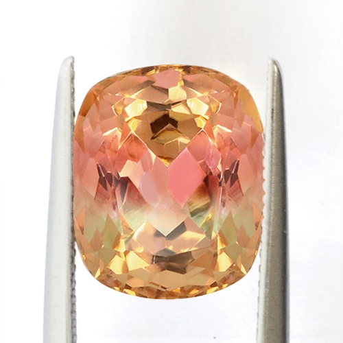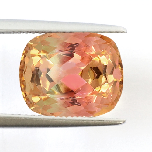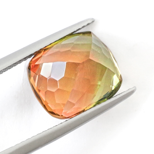An unusual, rare and beautiful Tourmaline. We took a classic parti-color pencil crystal and cut it as a cushion with a portuguese cut pavilion. the myriad of facets reflect the various colors though the stone creating a wonderful "kaleidoscope" effect of greens, pinks and oranges. The result is a truly unique and beautiful gemstone. Flawless and bursting with life, it is would make a spectacular piece of jewelry.