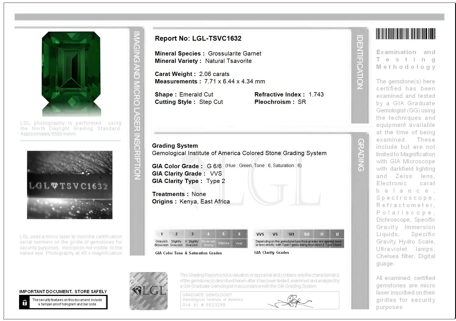 This is an outstanding and extremely fine Tsavorite. Fine Tsavorites over 2 carats are rare – the geology of the gem type is such that most crystals are crushed as they form, meaning that the vast majority of Tsavorite mined is very small. At 2.06 carats, and the finest quality - pure, intense green and flawless, this beautiful emerald cut is very rare.