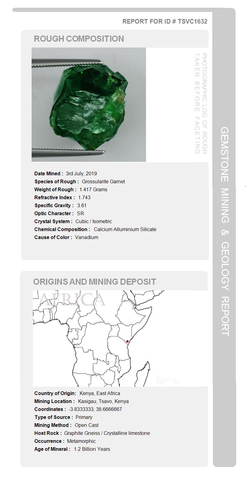 Millions of years later, as miners chiseled away at the mine face in the Wandani mining area they came across a “potato” or gem pocket. They chiseled it open and inside was a concentration of intense green gem quality Tsavorite. This was carefully clipped away from the host rock and collected into a “parcel” which was taken to Nairobi. Here, in our offices they were identified as fine Tsavorite crystals using sophisticated gemological equipment. They were bought, sorted and then “knocked” (a process using fine gem tools) in order to remove heavily included sections. Once this process was complete, the now clean crystals were then examined and cut. Cutting is a long and highly skilled process and our master cutters have over 30 years of experience each.