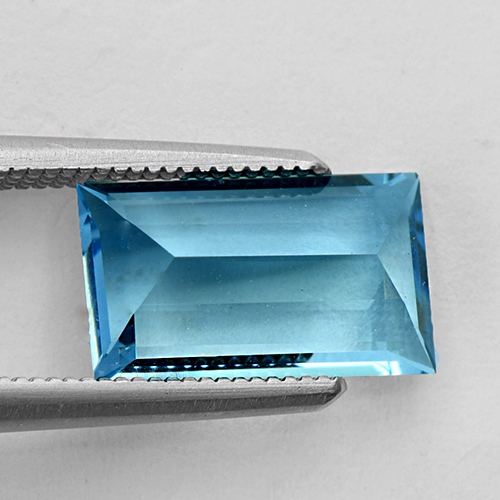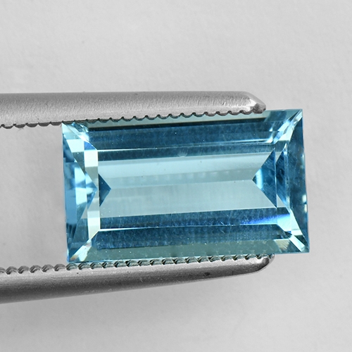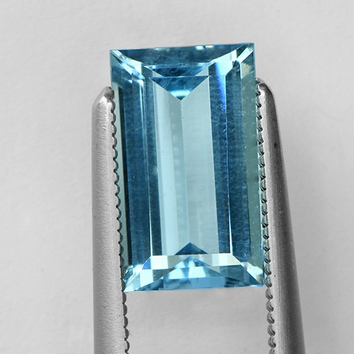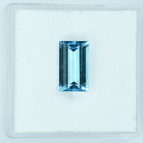 Baguettes can really glow courtesy of their clean lines. This one is no exception - it exudes a wonderful luster and the graceful sleek facets on the pavilion glow through the table. This stone boasts a fine sky blue hue and flawless clarity. Beautiful.