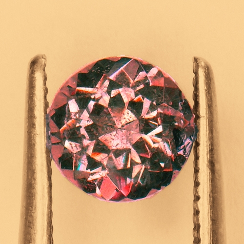 This captivating Round Brilliant Color Change Garnet, weighing 0.90 carats and measuring 5.55 x 5.55 x 3.84 mm, is an incredibly rare gemstone. It is distinguished by its extraordinary color transition from a mystical blue-green in natural daylight to a vibrant raspberry red under incandescent light. This remarkable color metamorphosis makes it a highly sought-after piece for gem collectors. You don't see these every day and they surpass even fine Alexandrite color changing abilities.
