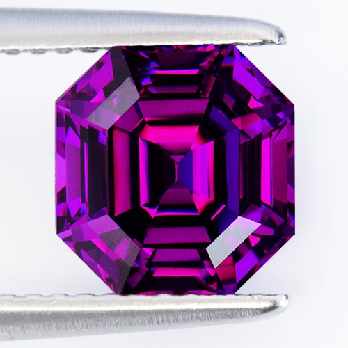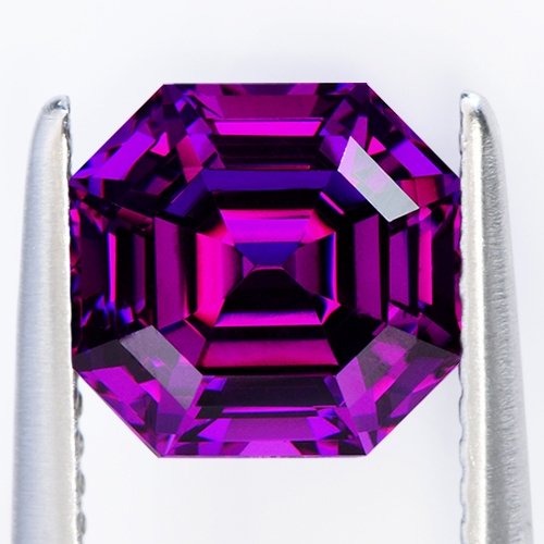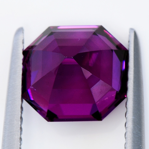 Although technically classed as Rhodolites, these special stones have some unusual and unique properties. They exhibit a rich grape hue under cool daylight but under incandescent they display an intense cranberry red with flashes of magenta. Lab analysis of the absorption spectra shows the main absorption bands dominating the green-yellow regions of the visible spectrum. Additionally, two strong blue and red transmission regions combine to produce an eye-visible purple color, and also account for the strong color change under different light sources.