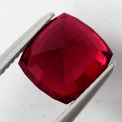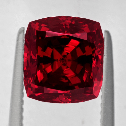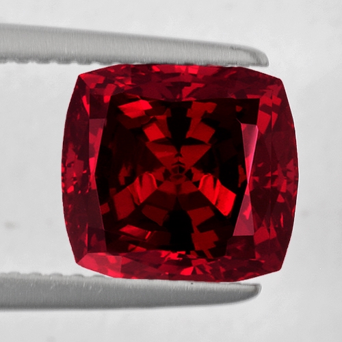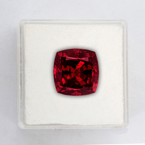 A very deep, intense robust red hue exudes from the depths of this beautiful 5.05 carat cushion cut Rhodolite. Tinges of purple glitter within the reds. Flawless clarity.