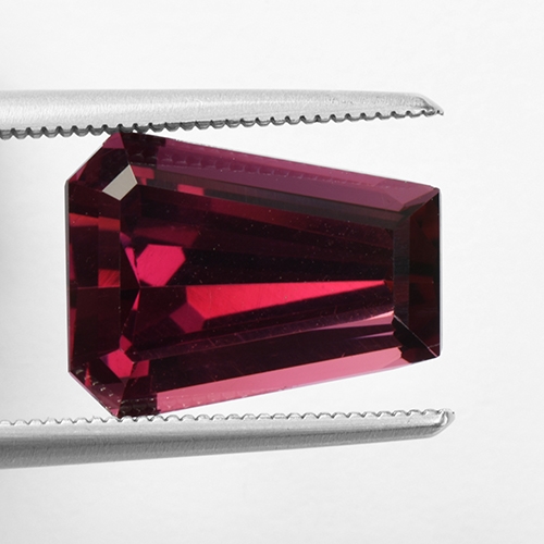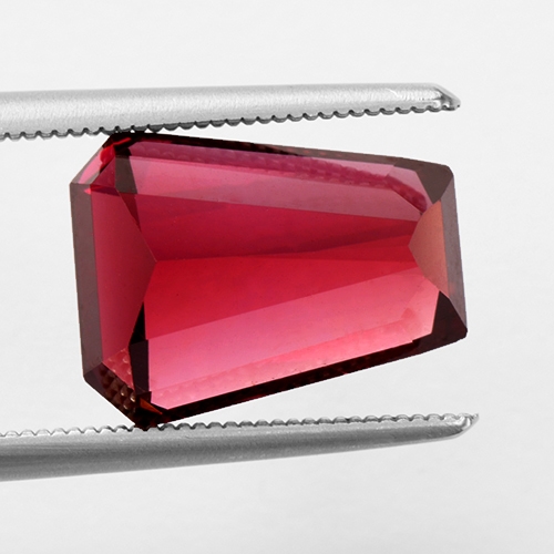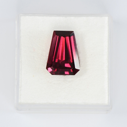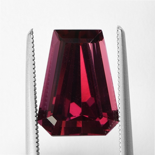 Superb. Intriguing and unique. A gorgeous fine color Rhodolite in a fancy cut. Perfect for a contemporary ring or pendant. Flawless and a stunning rich red color with a slight purple modifier.