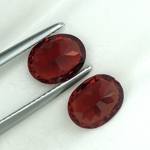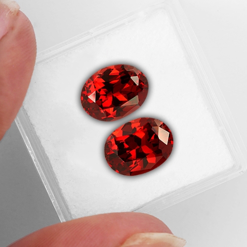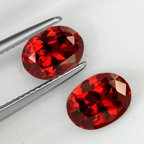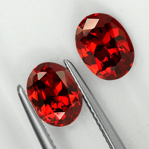 Ruby look-alikes. A very intense red matched pair of exquisite Rhodolite Garnets. Fathonless color. Wonderful brilliance. Flawless clarity. Gorgeous.