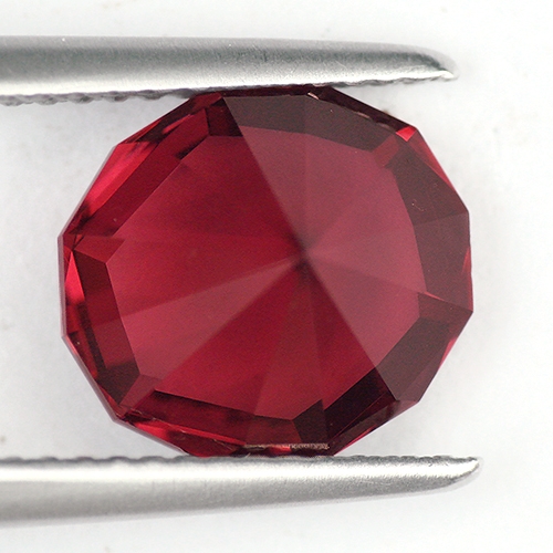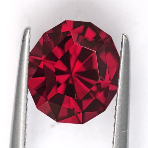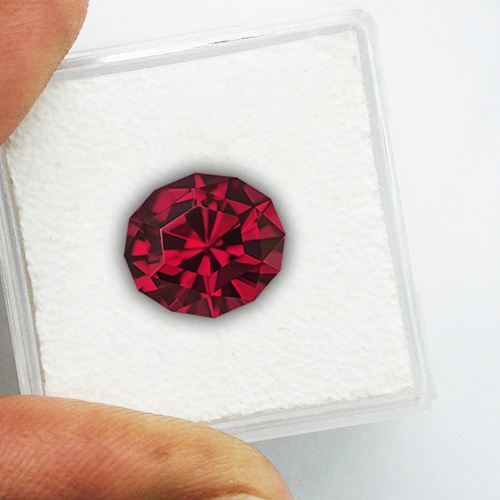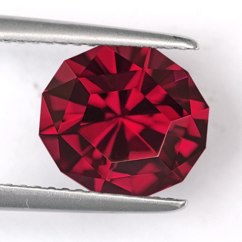 Very unique cutting bestowing a wonderful glow from deep within the stone. This is a really superb Rhodolite. Excellent color - deep raspberry red, superb cutting and flawless clarity.