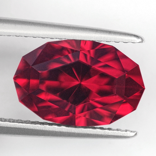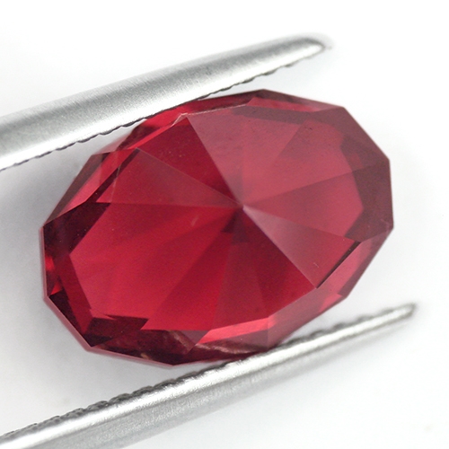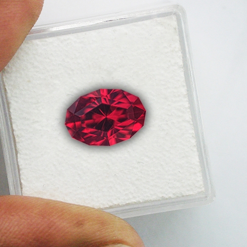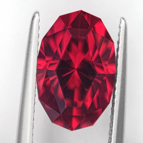 Intense red hues with pink modifiers. This is beautifully cut with an unusual facet arrangement that makes it very unique. Exceptional clarity - flawless at 10 x. A very nice Rhodolite.