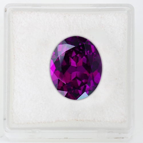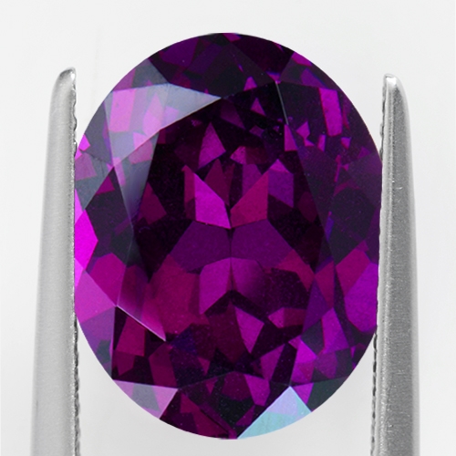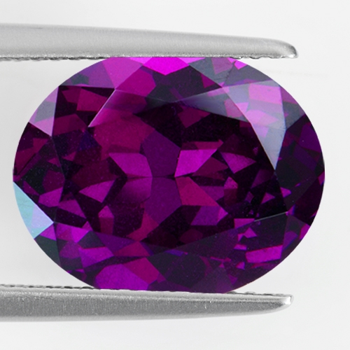 Although technically classed as Rhodolites, these special stones have some unusual and unique properties. They exhibit a rich grape hue under cool daylight but under incandescent they display an intense cranberry red with flashes of magenta. Lab analysis of the absorption spectra shows the main absorption bands dominating the green-yellow regions of the visible spectrum. Additionally, two strong blue and red transmission regions combine to produce an eye-visible purple color, and also account for the strong color change under different light sources.