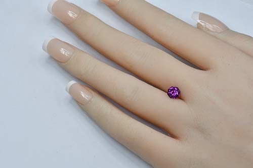 Although technically classed as Rhodolites, these special stones have some unusual and unique properties. They exhibit a rich grape hue under cool daylight but under incandescent they display an intense cranberry red with flashes of magenta. Lab analysis of the absorption spectra shows the main absorption bands dominating the green-yellow regions of the visible spectrum. Additionally, two strong blue and red transmission regions combine to produce an eye-visible purple color, and also account for the strong color change under different light sources.