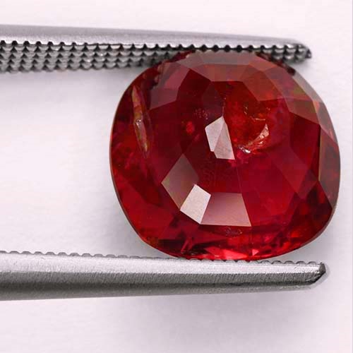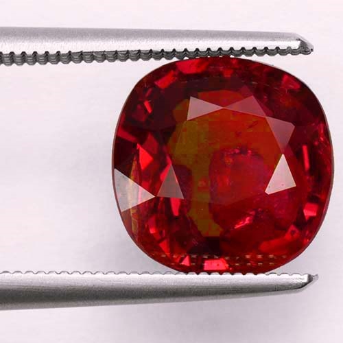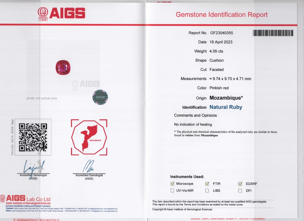 A large untreated Mozambique Ruby cushion. At 4.09 carats it is rare. Lovely color, albeit with a slight pinkish modifier. All the weight is in the table, making it look more like a 5 carater. AIGS certified - see the slideshow for scan of the certificate.