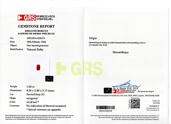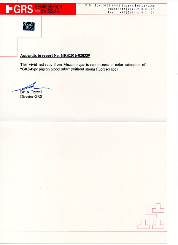 This is a an exceptional buy. A completely natural, untreated almost flawless "Pigeon's Blood" Ruby from the famed Gemfields Montepuez mine in Mozambique. Rubies of this coveted color and high clarity are exceptionally rare these days. You won't find its equal at this price anywhere else. It is independently GRS lab certified - view the slideshow for scans of the certificate. This is the sort of Ruby any collector or connoisseur will jump at.