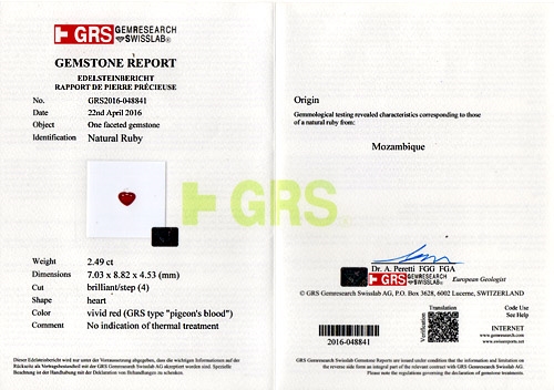 This is a very fine Ruby indeed. Classic top 1%'er from the Gemfields mine in Mozambique. It is a superb crystal. Graded "Pigeon's Blood" by GRS lab, it carries an independent GRS certificate which will be shipped with it. Check the slideshow for an image of it. Entirely natural - no treatment, not even heat which is unusual in today's Ruby market. It is very high clarity and a great cut. A superb opportunity to get a Ruby of this caliber at this price.