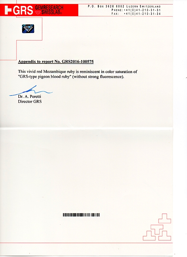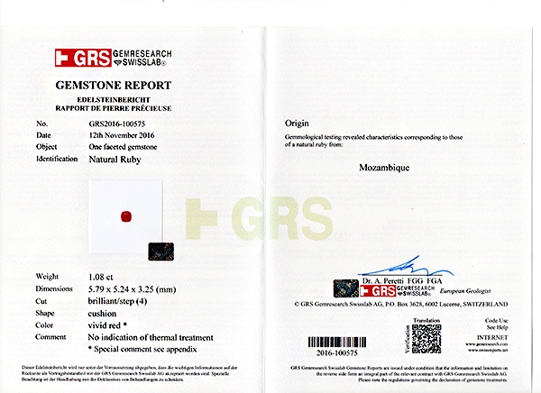 This refers to the gem’s origin. In some cases, as with Paraiba Tourmaline, Burmese Ruby, Kashmir Sapphire, the stone’s origin can mean a premium price. Mostly, however, this is not the case and gems are graded, sold and admired on their own merit. Origin is an important category on a gem certificate though as it basically refers to its "place of birth".