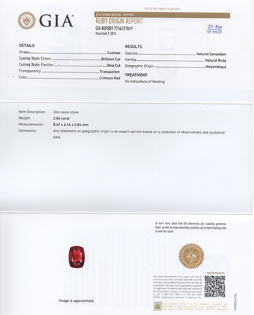 This refers to the gem’s origin. In some cases, as with Paraiba Tourmaline, Burmese Ruby, Kashmir Sapphire, the stone’s origin can mean a premium price. Mostly, however, this is not the case and gems are graded, sold and admired on their own merit. Origin is an important category on a gem certificate though as it basically refers to its "place of birth".