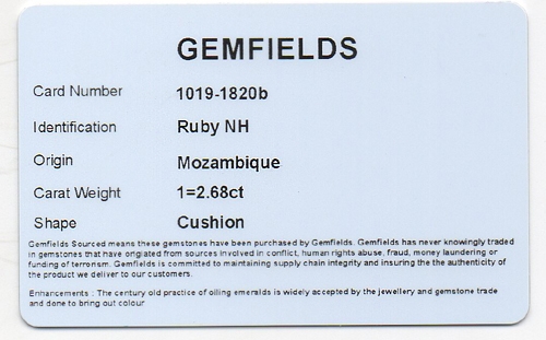 This is a lovely Ruby. A very fine "open" deep red with exceptional intensity. It is entirely natural, no heat or any other treatment. It is very well priced indeed.