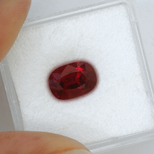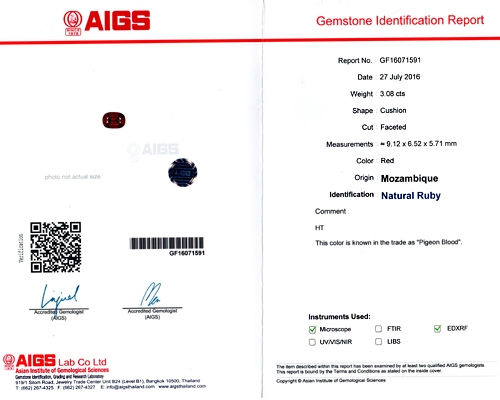 This incredible 3.08 carat cushion truly glows in your hand. The intense, vivid reds emanating from its core are mesmerizing. This is a very beautiful Ruby. Exceptional color - the very finest grade known as "Pigeons Blood" in the trade, this stone carries an independent AIGS Certificate certifying it as "Pigeons Blood". High clarity and a fine crystal. This is a winner.