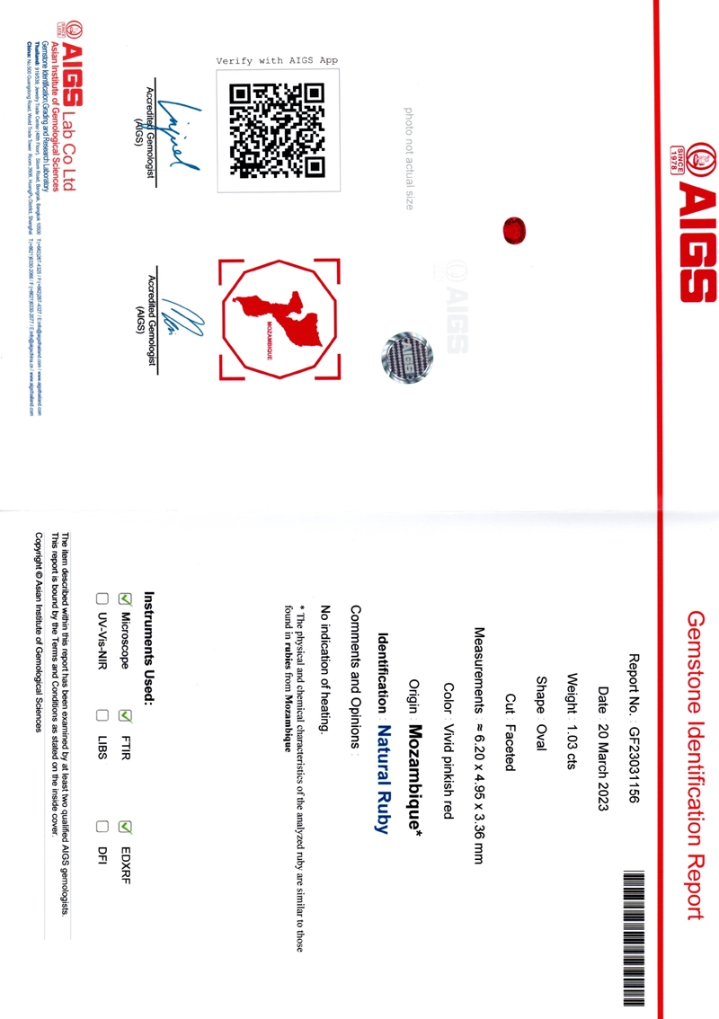 AIGS Certified No Heat, no treatment, natural Mozambique Ruby (view slideshow for a scan of the AIGS certification) Gorgeous color and a nice crystal. A very fine Ruby from the famed Gemfields Mine.