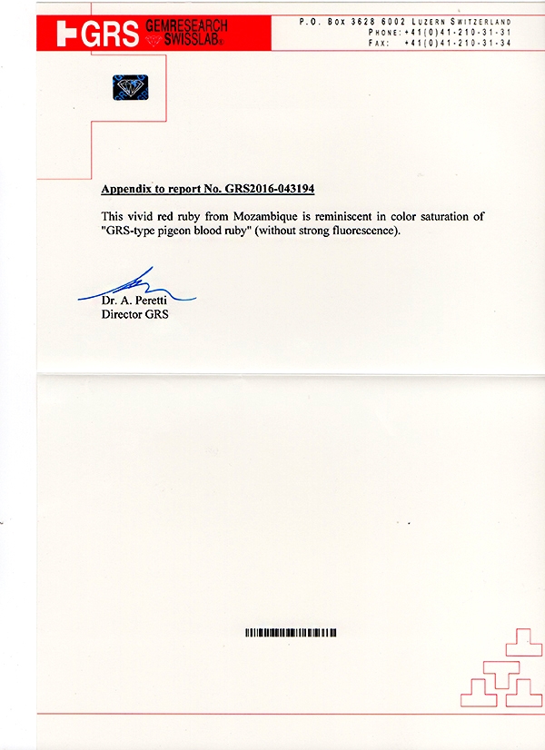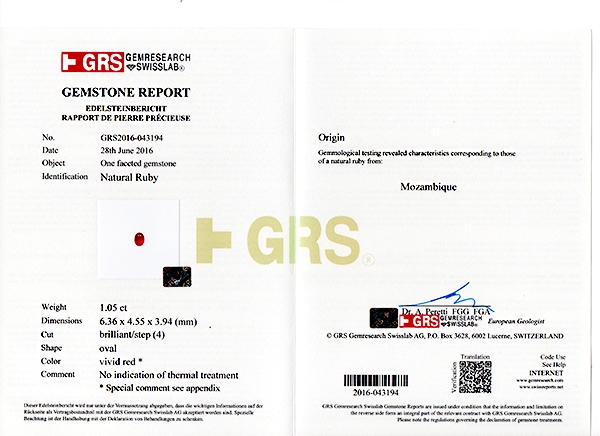 This refers to the gem’s origin. In some cases, as with Paraiba Tourmaline, Burmese Ruby, Kashmir Sapphire, the stone’s origin can mean a premium price. Mostly, however, this is not the case and gems are graded, sold and admired on their own merit. Origin is an important category on a gem certificate though as it basically refers to its "place of birth".