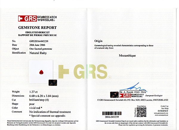 This refers to the gem’s origin. In some cases, as with Paraiba Tourmaline, Burmese Ruby, Kashmir Sapphire, the stone’s origin can mean a premium price. Mostly, however, this is not the case and gems are graded, sold and admired on their own merit. Origin is an important category on a gem certificate though as it basically refers to its "place of birth".