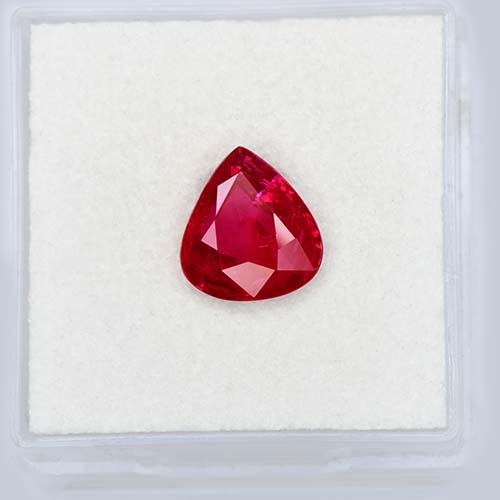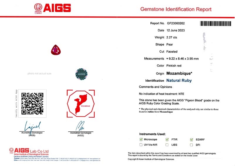 We are thrilled to present this exceptional 2.27 carat Pear Mixed Step Cut Ruby, boasting a vibrant Pigeon's Blood color that is sure to captivate. Measuring 9.22 x 8.46 x 3.95 mm in size, this stunning gemstone is independently certified by the esteemed AIGS Laboratory as unheated and Pigeon's Blood color (view the slideshow for a scan of the certificate) This gorgeous gem is characterized by an abundance of sparkle, which is only amplified by its unique mixed step cut design. The unheated nature of this Ruby adds to its allure, as it retains its natural beauty and vitality. Extracted from the renowned Gemfields mines in Mozambique, a region famous for producing some of the world's finest rubies, this top-grade material is a true gem. Whether you're seeking an investment piece or a statement accessory, this Pear Mixed Step Cut Ruby is sure to impress with its rich color, exceptional cut, and impressive size. Its independent certification ensures that it meets the highest standards of quality and authenticity. We are confident that this exceptional Ruby will be a treasured addition to any collection.