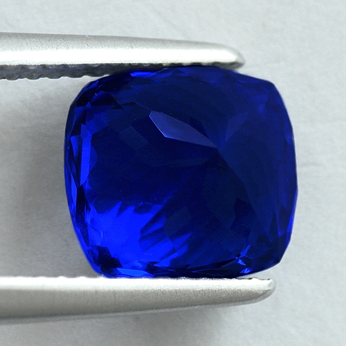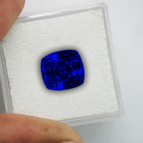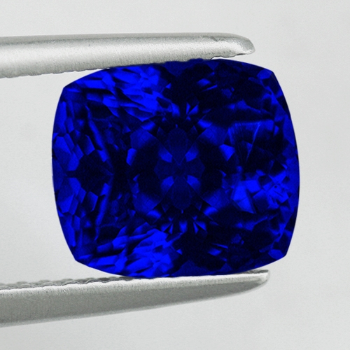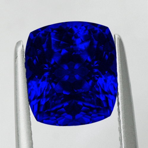 A fine and rare Tanzanite. This wonderful cushion cut boasts all the characteristics of the very top 1% of Tanzanites. A remarkable depth and vividness of color cut predominately on the blue axis leading to a very fine sharp crisp blue in white light and flecked with periwinkle and violet in incandescent light. Flawless clarity and good brilliance complete the package. A fine, rare Tanzanite indeed.